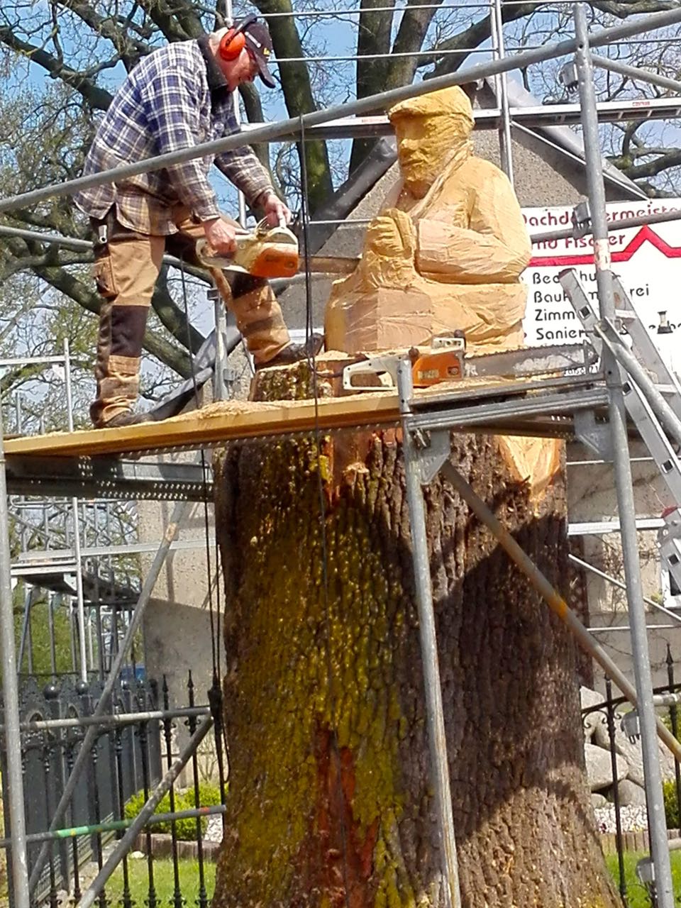 So geht’s auch: Der Röbeler Künstler Paul Kleidon verwandelt mit der Motorsäge gerade eine kranke Eiche in ein Kunstwerk. Und das bekommt den Namen „Säender Bauer“.