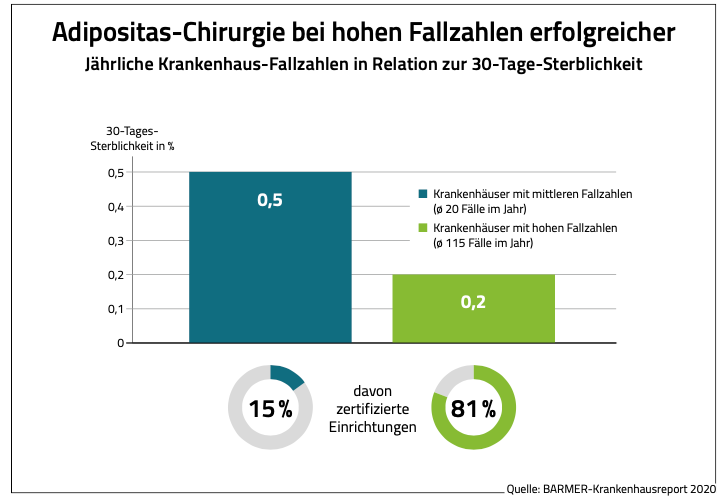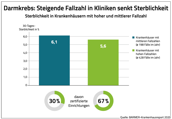 Den Report-Ergebnissen zufolge wird sehr deutlich, dass sich vor allem bei den Krebs-Operationen, aber auch der Adipositaschirurgie Erfahrung auszahlt. „Bei örtlichen Tumorentfernungen im Fall von Darmkrebs verringert eine Verdopplung der Fallzahl die Sterblichkeit von 4,4 Prozent um 0,8 Prozentpunkte auf 3,6 Prozent. Außerdem wird die Rate an spezifischen Komplikationen von 16,6 Prozent um 2 Prozentpunkte verringert. Damit die Patienten keinem unnötigen Risiko ausgesetzt sind, sind vorgegebene Mindestmengen für bestimmte Eingriffe ein sinnvolles Instrument“, betonte Prof. Dr. Boris Augurzky, Autor des Krankenhausreports und Leiter des Kompetenzbereichs „Gesundheit“ am RWI – Leibniz-Institut für Wirtschaftsforschung in Essen.