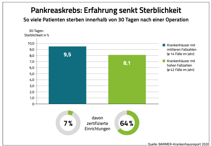 Jedes Jahr sterben in Deutschland rund 100.000 Menschen nach einer Operation im Krankenhaus. Viele dieser Todesfälle wären durch eine Operation in einer Klinik mit mehr Erfahrung vermeidbar. Diesen Schluss legt der aktuelle Krankenhausreport der Barmer nahe. Allein bei Eingriffen wie bei Pankreas- und Darmkrebs könnten in zehn Jahren knapp 3.800 Todesfälle verhindert werden, wenn diese Operationen in Krankenhäusern mit doppelt so hoher Fallzahl durchgeführt würden. Trotzdem erfolgen immer noch viele Eingriffe in Häusern, die vergleichsweise wenig Erfahrung haben.