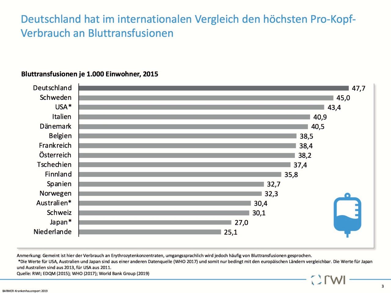 Deutschland benötigt so viel Spenderblut pro Kopf wie kein anderes Land. Allein im Jahr 2017 wurden hierzulande mehr als 3,2 Millionen Blutkonserven eingesetzt. Deutsche Krankenhäuser könnten jedoch rund eine Million Blutkonserven pro Jahr einsparen. Die Voraussetzung dafür ist, Patienten wie beispielsweise in den Niederlanden konsequent mit einem speziellen Behandlungskonzept zur Stärkung der körpereigenen Blutreserven, dem „Patient Blood Management“ (PBM), auf planbare Operationen vorzubereiten. Zu diesem Schluss kommt der BARMER-Krankenhausreport 2019. „Im Sinne der Patientensicherheit sollten Bluttransfusionen so sparsam wie möglich eingesetzt und das Patient Blood Management bundesweit konsequent umgesetzt werden. Damit werden Patienten auf Operationen besser vorbereitet, unnötige Blutverluste reduziert und Transfusionen samt ihren Risiken seltener“, sagte der Vorstandsvorsitzende der BARMER, Prof. Dr. Christoph Straub.