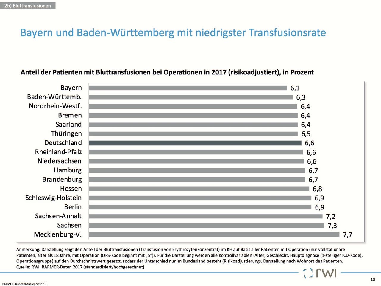 Den Reportergebnissen zufolge gibt es zudem deutliche regionale Unterschiede bei den Transfusionsraten. In Bayern und Baden-Württemberg erhielten zum Beispiel nur 6,1 beziehungsweise 6,3 Prozent der Patienten bei einer Operation Bluttransfusionen. In anderen Bundesländern wie Mecklenburg-Vorpommern wurden knapp acht Prozent erreicht. „Über die Gründe dieser regionalen Unterschiede lässt sich nur spekulieren. Womöglich werden jeweils unterschiedlich stark blutsparende Operationstechniken eingesetzt. Ein Grund könnten auch verschiedene Grenzwerte sein, die bestimmen, ab welchem Blutverlust eine Blutkonserve bereits transfundiert wird“, betonte Augurzky. Insgesamt zeige sich aber ein positiver Trend, denn seit dem Jahr 2009 sei in allen Bundesländern ein Rückgang bei Bluttransfusionen zu verzeichnen. Ein Beispiel dafür ist laut dem Krankenhausreport Mecklenburg-Vorpommern. Hier betrug die Transfusionsrate vor zehn Jahren noch zehn Prozent.