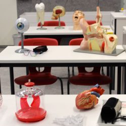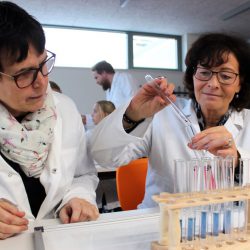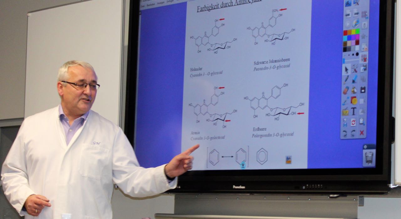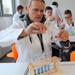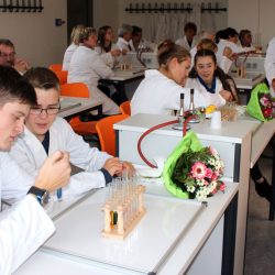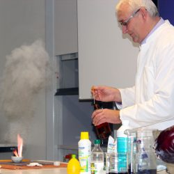 Denn die geladenen Besucher mussten sich gleich am Eingang entscheiden, was für eine Stunde sie denn gerne absolvieren möchten: Chemie, Biologie oder Physik. Bekleidet mit weißen Kitteln ging’s in Chemie beispielsweise um den Rotkohl, oder besser um den Saft des Rotkohls und seine Reaktion auf verschiedene Haushaltsreiniger. Aber natürlich hat Chemielehrer Gerd Manske auch dem bekannten Spruch “ Chemie ist das, was knallt und stinkt“ alle Ehre gemacht. Es hat ordentlich geknallt und anschließend auch gestunken.