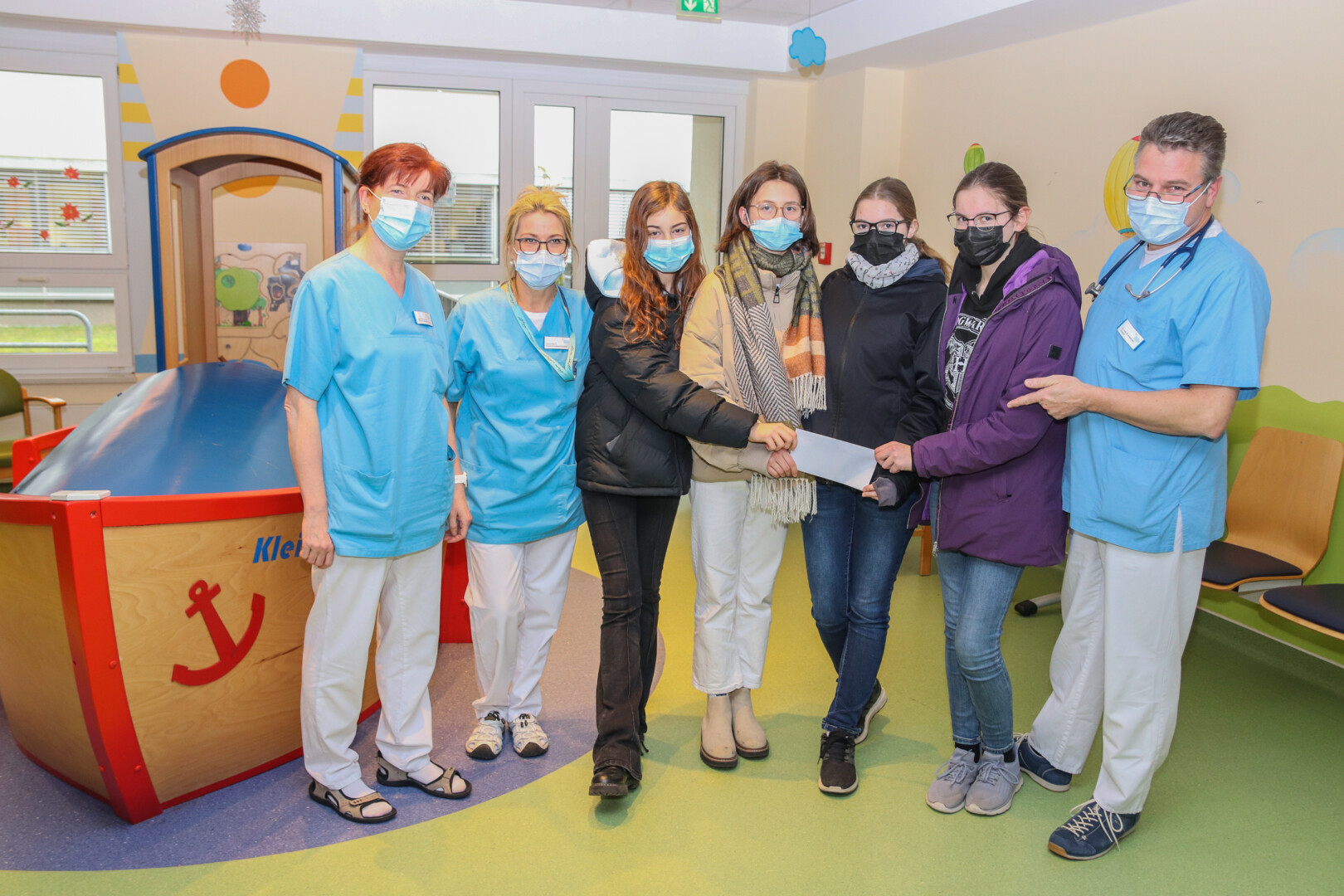 Dr. med. Sven Armbrust, Chefarzt der Klinik für Kinder- und Jugendmedizin, sowie Kinderkrankenschwester Jeannette Mundthal, Vorsitzende des Fördervereins Kind im Krankenhaus e.V., bedankten sich bei den Schülerinnen, dass sie mit ihrer Spende die kleinen Patienten im Krankenhaus unterstützen. Denn vieles auf den Stationen und in der Ambulanz ist nur durch Spenden möglich geworden – wie das große Boot im Wartebereich, die gestalteten Wände, die Spielzimmer, die Klinik-Clowns, die regelmäßig zu Gast sind.