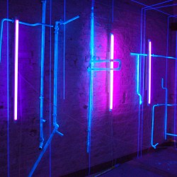 „Die Realität holt uns zurück in den Innenraum“, schreibt Borchardt dazu. In blaues Licht mit Wollfäden und Wasserleitungen hat ihr Künstlerkollege Rainer Viltz einen dunklen Raum daneben getaucht, dazu läuft eine Klanginstallation.