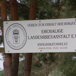 Die einstige Landesirrenanstalt für Mecklenburg-Strelitz, vergleichbar mit Häusern wie Sachsenberg in Schwerin und Gehlsdorf in Rostock, wurde 1902 im Reformgeist der neuen Psychiatriebewegung für rund 200 Patienten gegründet. Obwohl auch Domjüch an der Aktion T4 (Tötung unwerten Lebens) in der NS-Zeit beteiligt war, konnten viele Patienten durch Neustrelitzer Ärzte vor dem Vergasen in Bernburg (Sachsen-Anhalt) bewahrt werden. Nach Kriegsende besetzte die Rote Armee 1945 das Gelände, rund 20 Gebäude wurden dazu gebaut. Zwei Friedhöfe verschwanden.