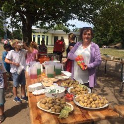Zur Musik vom DJ schwangen die Mädchen und Jungen die Hüften, und in einer kleinen Modenschau zeigten besonders die Mädels ihre gebastelten Schmuckstücke, Armbänder und Ketten. Und natürlich durfte auch das Essen nicht zu kurz kommen. Es wurde Knüppelkuchen gebacken, Popcorn fand reißenden Absatz und leckeres Streetfood in Form von Gemüsesticks ebenso. Und auch Kartoffel- und Nudelsalat sowie die verschiedenen selbst gemachten Limonaden kamen gut an, fruchtige Bowle und frisches Obst ebenso.
