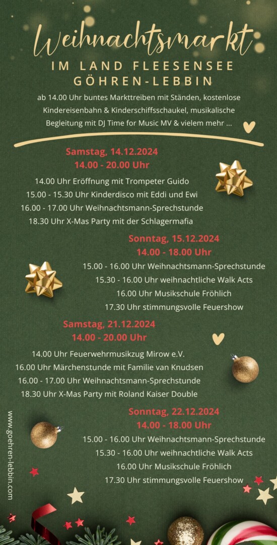 Gleich an zwei Wochenenden wird es auf dem Marktplatz in Göhren-Lebbin richtig weihnachtlich und kuschlig. Am 3. und 4. Adventswochenende lädt Göhren-Lebbin zum traditionellen Weihnachtsmarkt mit einem stimmungsvoll dekorierten Marktplatz ein. Das Angebot reicht von festlich geschmückten Verkaufsständen mit traditionellem Kunsthandwerk bis hin zu weihnachtlichen Köstlichkeiten. Dabei sind viele regionale Produkte im Angebot. Als besonderes Highlight für die kleinen Gäste gibt es an allen Veranstaltungstagen eine kostenfreie Schiffsschaukel und ein Kinderkarussell. Auch Live-Musik, unter anderem mit der beliebten Schlagermafia aus Waren, steht auf dem Plan. Und selbstverständlich guckt der Weihnachtsmann regelmäßig vorbei.