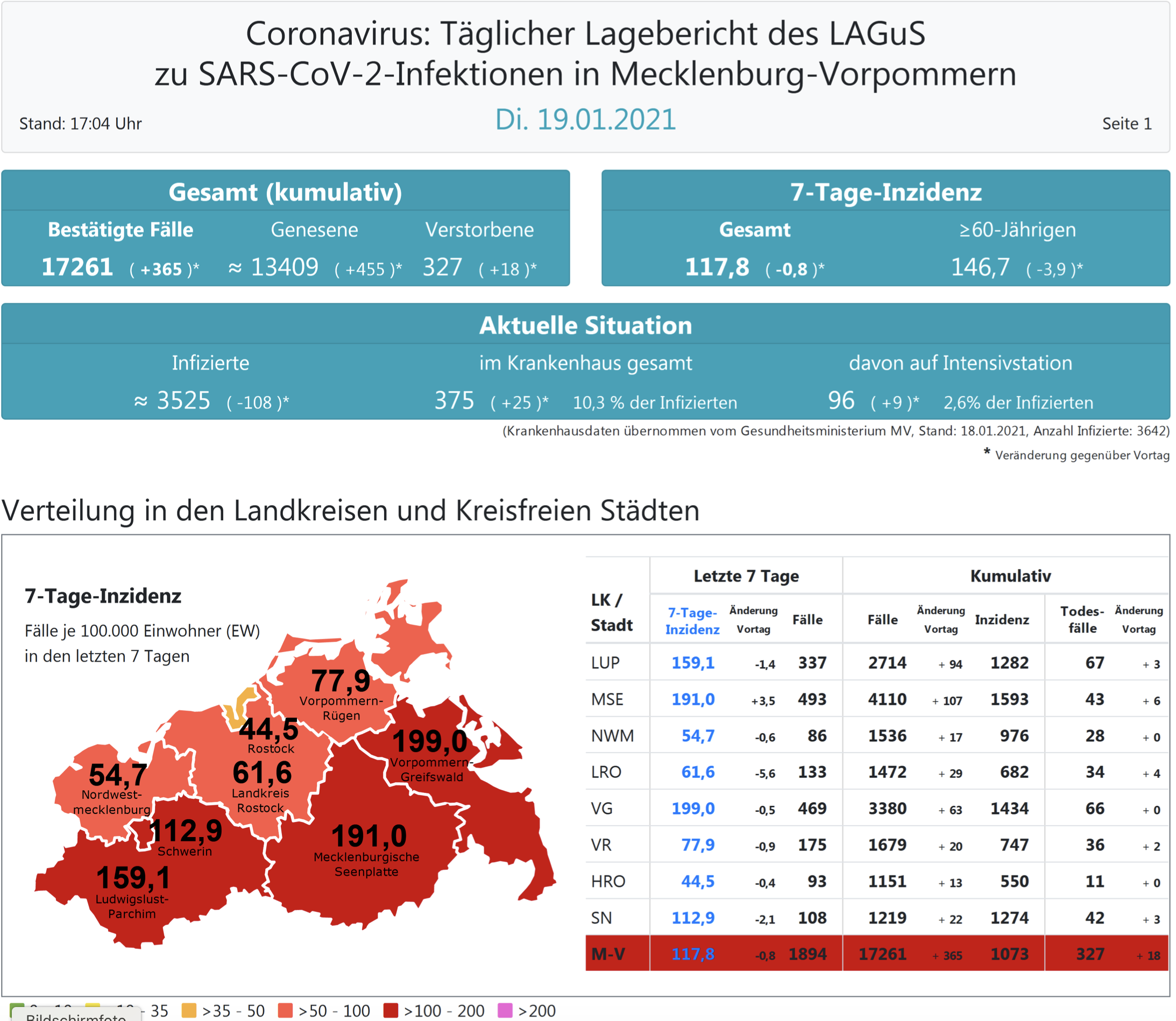 Der Inzidenzwert im Landkreis Mecklenburgische Seenplatte ist wieder leicht gestiegen und liegt heute bei 191 (gestern 187,5). Außerdem meldet der Kreis heute sechs Todesfälle. Im gesamten Land Mecklenburg-Vorpommern gab es 365 Neuinfektionen, im Landkreis Mecklenburgische Seenplatte 107. In ganz Mecklenburg-Vorpommern liegt der Inzidenzwert heute bei 117,8 (gestern 118,7).