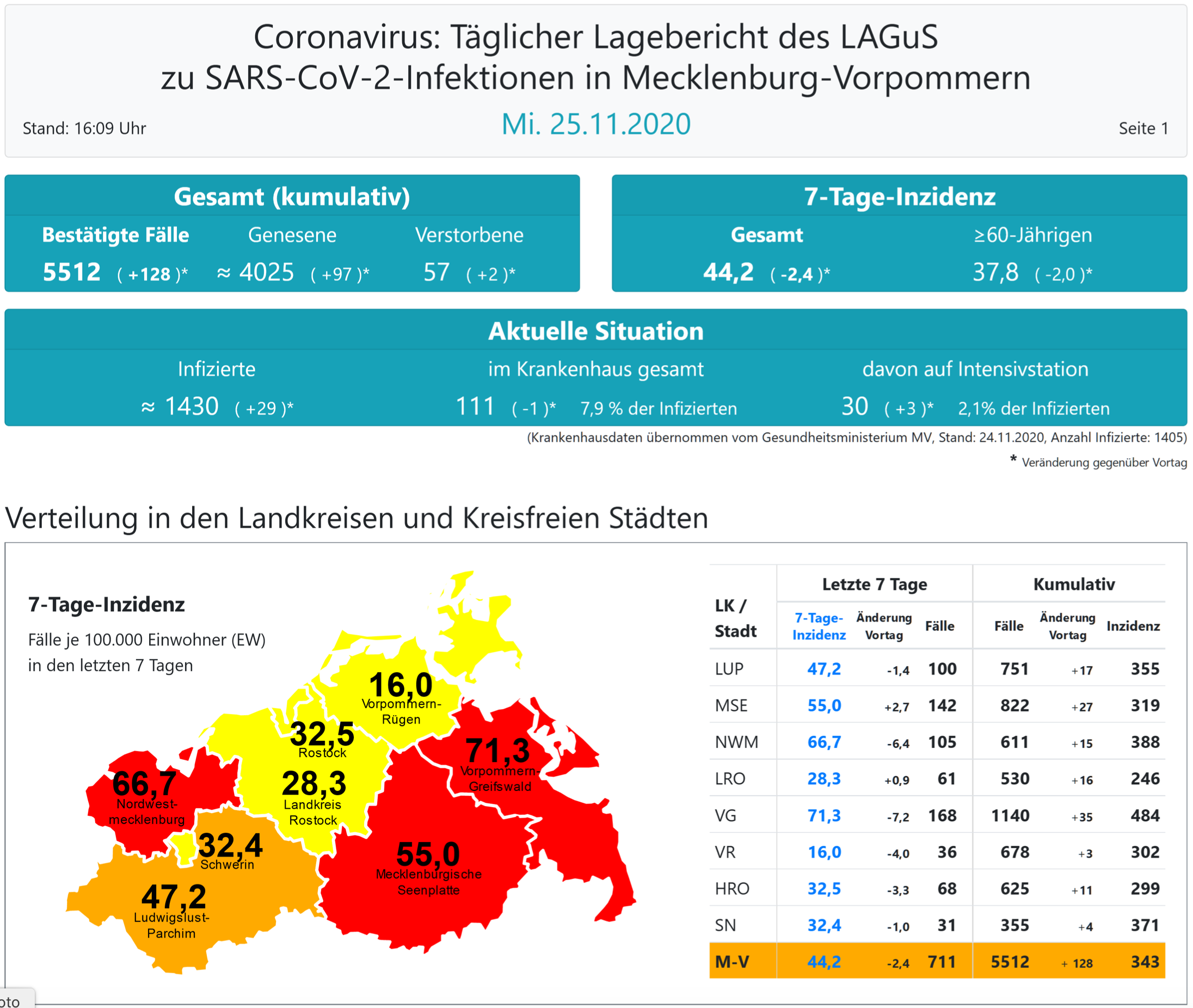 Insgesamt wurden in MV bisher 5512 Infektionen festgestellt. Insgesamt gab es bislang 57 Todesfälle im Land.