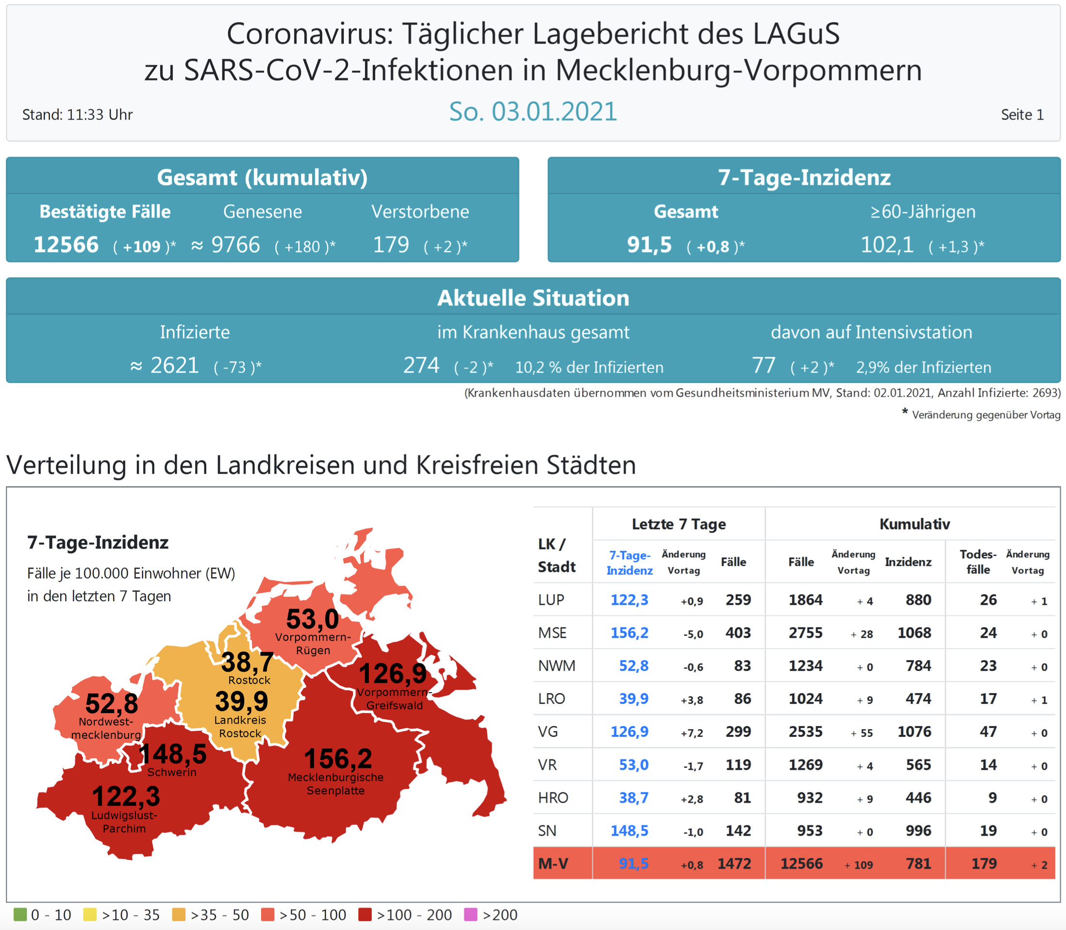 Das Landesamt für Gesundheit registriert für Mecklenburg-Vorpommern bis heute Mittag 109 neue Fälle. Der Landkreis Mecklenburgische Seenplatte meldet 28 Neuinfektionen. Der Inzidenzwert liegt in unserem Landkreis heute bei 156,2 und damit weiter am höchsten in Mecklenburg-Vorpommern. Diese Zahlen sind aber nicht besonders aussagekräftig, da während des Jahreswechsels weniger getestet und auch gemeldet wurde.