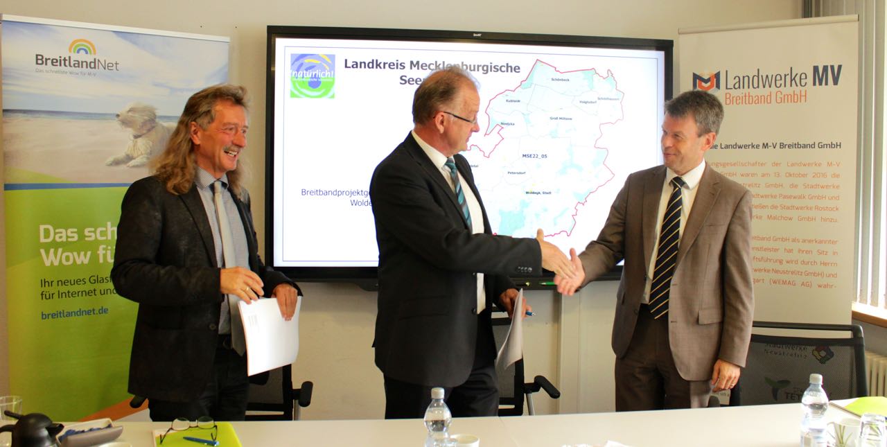 Schnelles Internet gibt es bald auch im Umland von Woldegk: Der Landkreis Mecklenburgische Seenplatte hat einen entsprechenden Vertrag für den Breitbandausbau mit der Landwerke M-V Breitband GmbH geschlossen. Landrat Heiko Kärger und die Geschäftsführer der Landwerke M-V Breitband GmbH, Frank Schmetzke und Caspar Baumgart, unterzeichneten gestern in Neubrandenburg den Vertrag. Er sieht die Breitbanderschließung sogenannter weißer Flecken in den Gemeinden Groß Miltzow, Kublank, Lindetal, Neetzka, Schönbeck, Schönhausen, Voigtsdorf und in Woldegk vor.