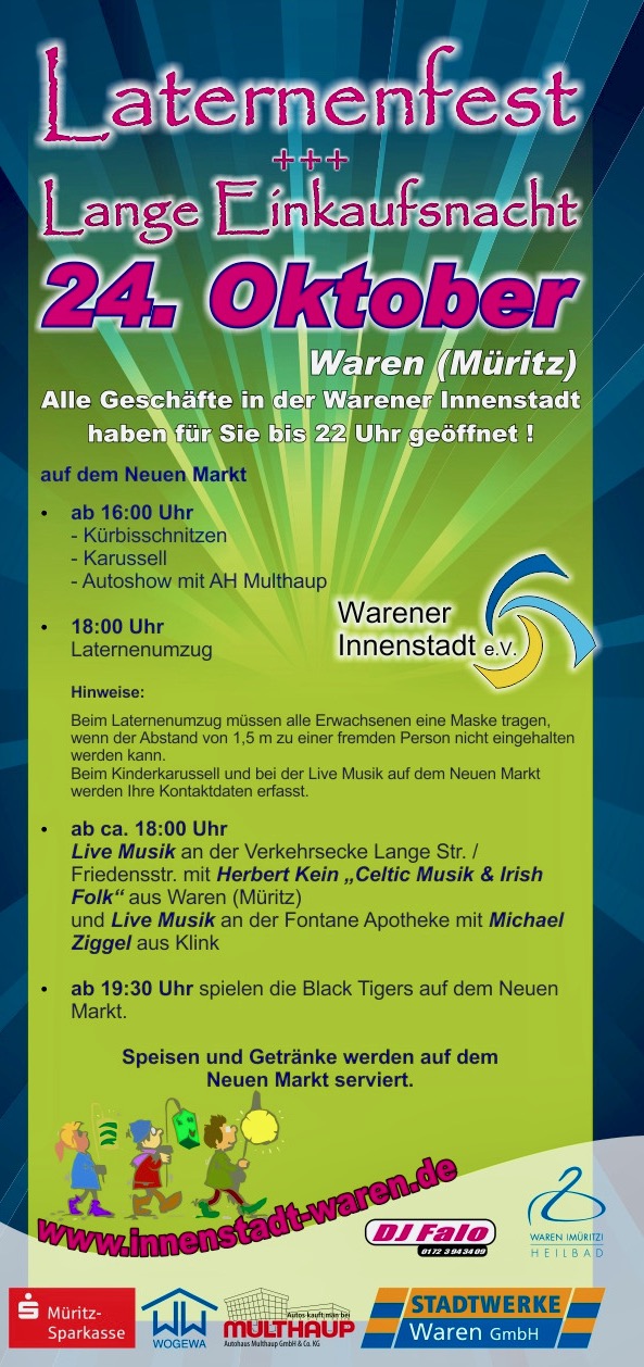 Gute Nachrichten für alle, die sich darauf freuen: Trotz aller Einschränkungen, die wegen der aktuellen Corona-Zahlen nötig sind, darf die Lange Einkaufsnacht mit Laternenfest und Live-Musik auf dem Neuen Markt in Waren stattfinden. Allerdings müssen sich die Besucher an die Vorschriften halten.
