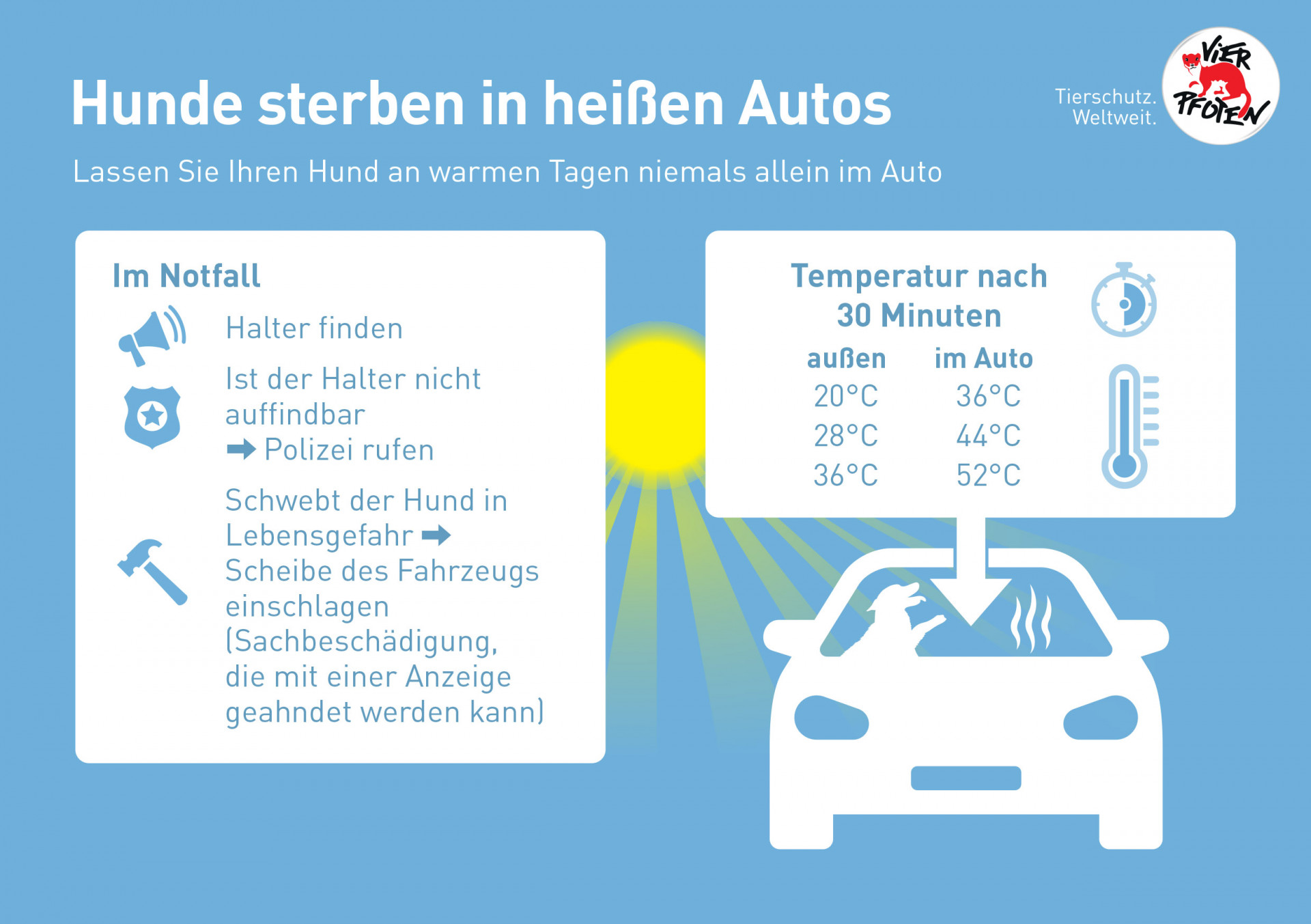 Der Sommer ist da, und die Temperaturen steigen wieder. Hundehalter sind jetzt in der Verantwortung, ihren Vierbeiner vor zu großer Hitze zu schützen. VIER PFOTEN Heimtier-Expertin Sarah Ross gibt Tipps für das richtige Verhalten bei heißem Wetter und warnt eindringlich davor, Hunde alleine im Auto zurückzulassen. Ein aufgeheiztes Auto ist eine häufig unterschätzte Gefahr: Nur schnell in den Supermarkt, während der Hund im Wagen wartet? Das kann jetzt gefährlich werden. Gerade, wenn ein Auto in der Sonne steht, können die Temperaturen im Inneren schnell auf das Doppelte ansteigen. „Hunde sind der Hitze in einem geschlossenen Auto hilflos ausgeliefert und können diese alleine durch ihr Hecheln nicht kompensieren. Ist es draußen gerade einmal 20 Grad warm, steigt die Temperatur im Auto innerhalb einer halben Stunde bereits auf 36 Grad an. Bei sommerlichen 28 Grad Außentemperatur sind es im Auto nach 30 Minuten schon 44 Grad. Und bei 36 Grad Außentemperatur heizt sich das Auto nach nur 30 Minuten auf 52 Grad auf. Schon nach wenigen Minuten kann der Hund einen Hitzeschock bekommen und das Auto zur Todesfalle werden. Ganz wichtig: Die Scheibe einen Spalt aufzulassen verhindert keinen Hitzestau“, sagt Sarah Ross.