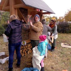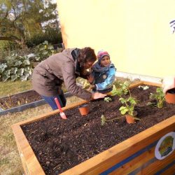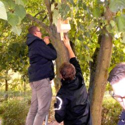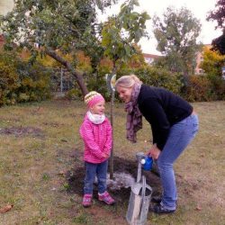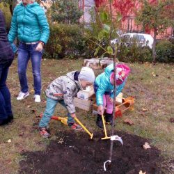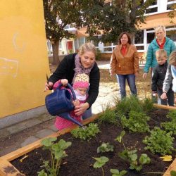 Deshalb sind in dieser Woche sieben Obstbäume gepflanzt, drei Hochbeete mit Erdbeeren und Kräutern bepflanzt sowie diverse Johannis-, Jochel-, Him- und Brombeeren gesetzt worden. Außerdem brachten Mitarbeiter und Eltern drei  Nistkästen an und stellten ein Futterhäuschen auf. Viel Freude bereitete den Kindern das Befüllen des riesigen Insektenhotels und natürlich das Angießen der Bäume und Sträucher.
