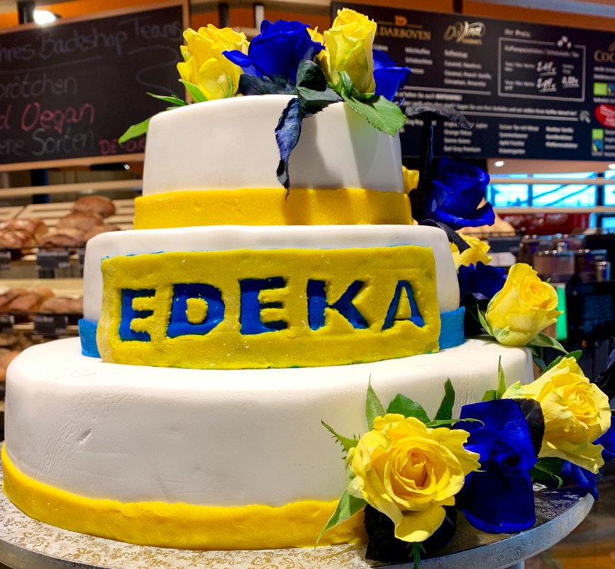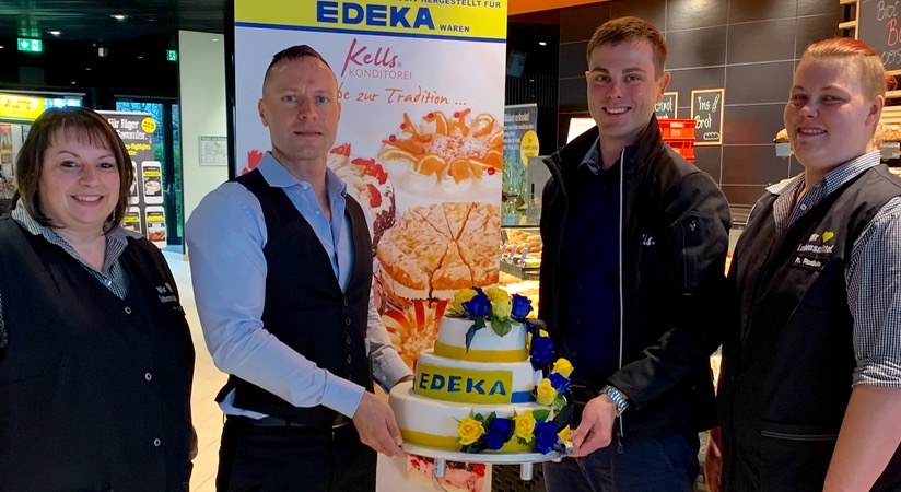 Foto unten: EDEKA-Geschäftsführer Ingolf Schubert und Oliver Kell, Inhaber des gleichnamigen Klinker Bauernmarktes, arbeiten künftig zusammen. Sehr zur Freude von Marktleiterin Daniela Tulke (links) und Back-Expertin Sarah Radicke. Zum Start gab’s aus Kells Konditorei eine besondere EDEKA-Torte, die sich die Mitarbeiter schmecken lassen durften.