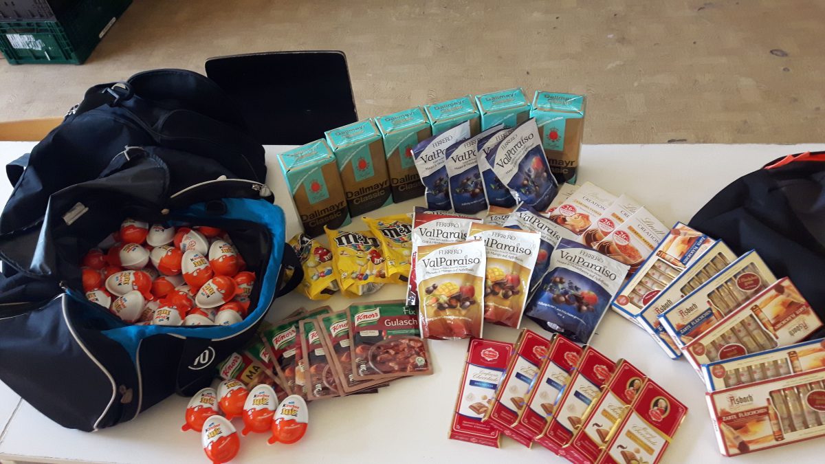 Der übrig gebliebene Teil, über 70 Kinder Joy Überraschungseier, mehrere Tafeln „Lindt“ und „Ferrero“ Schokolade, M&Ms und Kaffee, wurde gestern der „Warener Tafel“ übergeben.