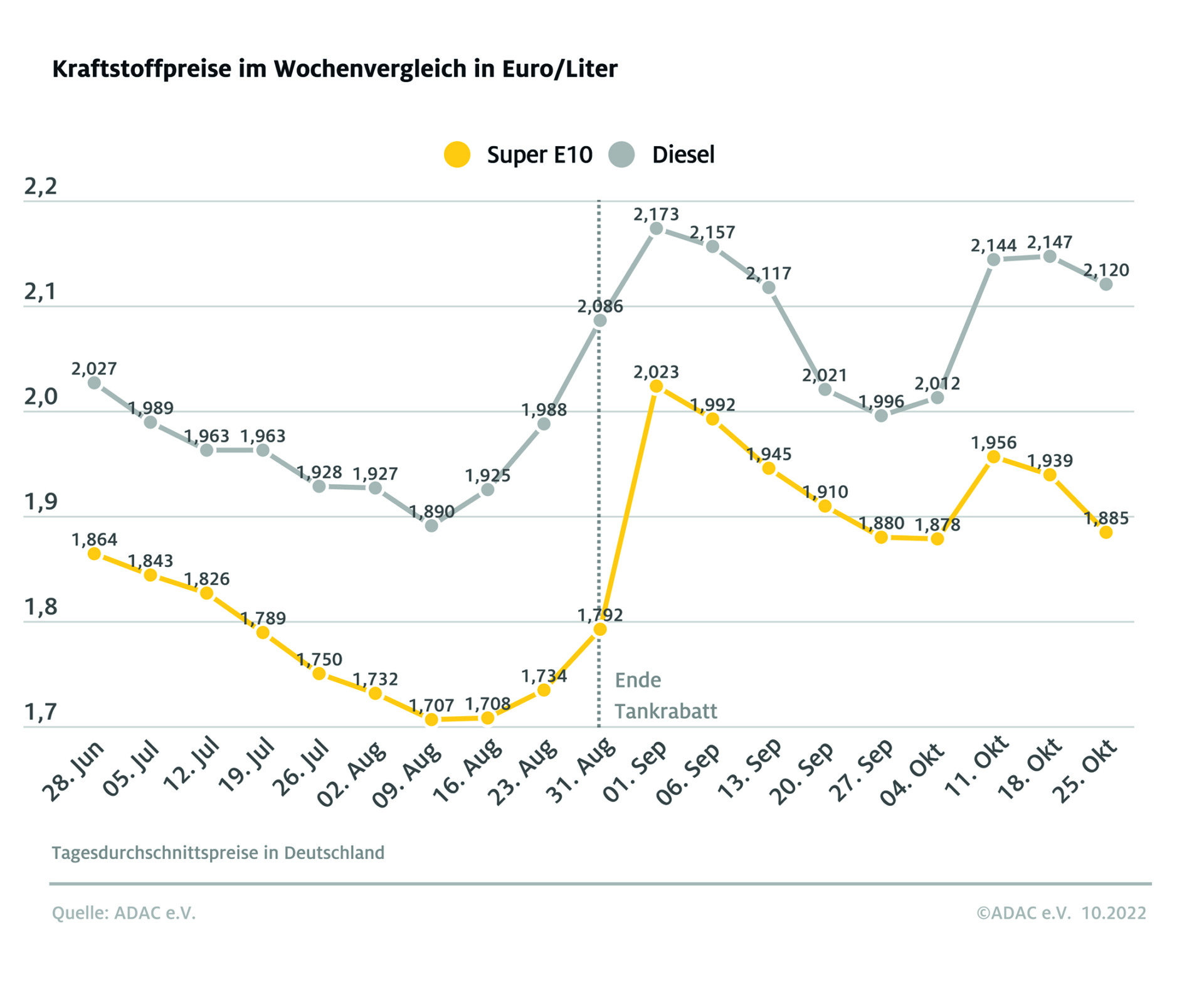 Laut aktueller Auswertung des ADAC sind sowohl die Preise von Diesel als auch Super E10 im Vergleich zur Vorwoche gesunken. Bei Super E10 war der Rückgang mit 5,4 Cent auf einen Durchschnittspreis von 1,885 Euro pro Liter doppelt so groß wie bei Diesel. Dieselkraftstoff vergünstigte sich um 2,7 Cent je Liter von 2,147 Euro auf 2,120 Euro. Trotz des leichten Rückgangs sind die Preise an den Tankstellen immer noch deutlich zu hoch, vor allem bei Diesel.