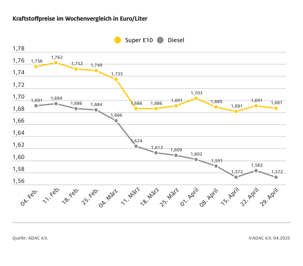 Bei den Kraftstoffpreisen ist Bewegung drin, das hat die wöchentliche Auswertung des ADAC der Preise von mehr als 14.000 Tankstellen in Deutschland ergeben. Nach dem Anstieg in der vergangenen Woche sinken die Preise von Benzin und Diesel diese Woche wieder: Super E10 verbilligte sich im bundesweiten Durchschnitt um 0,4 Cent auf jetzt 1,687 Euro, Diesel sogar um 1,1 Cent auf aktuell 1,572 Euro je Liter.
