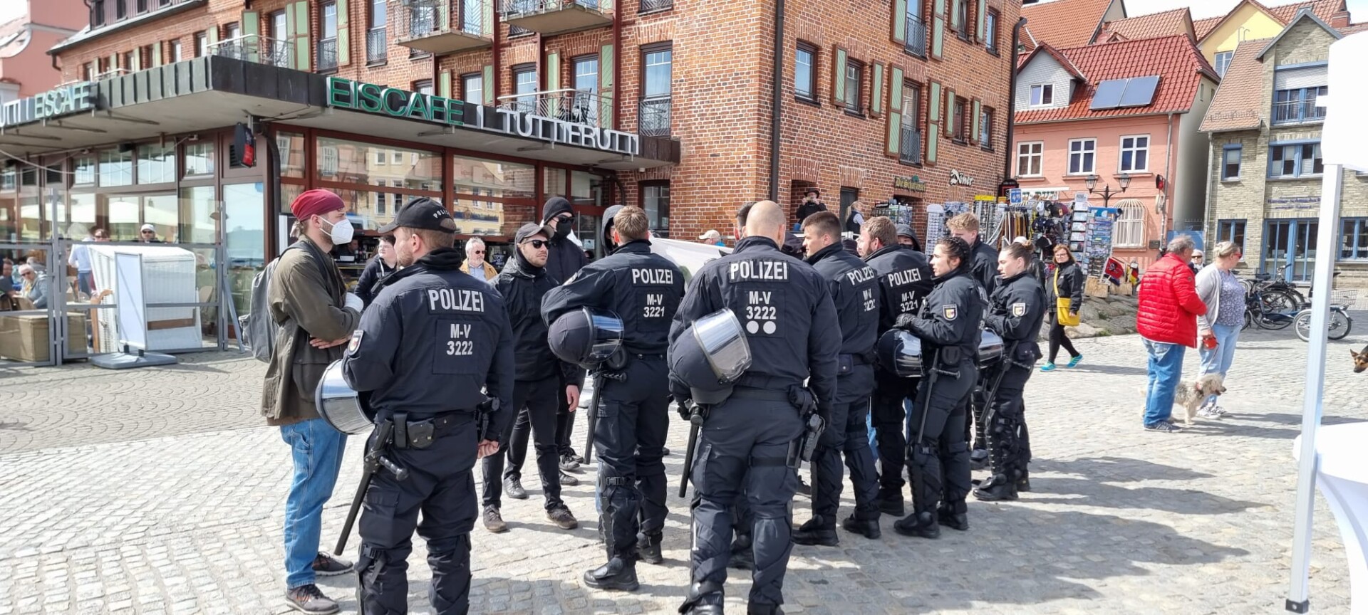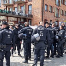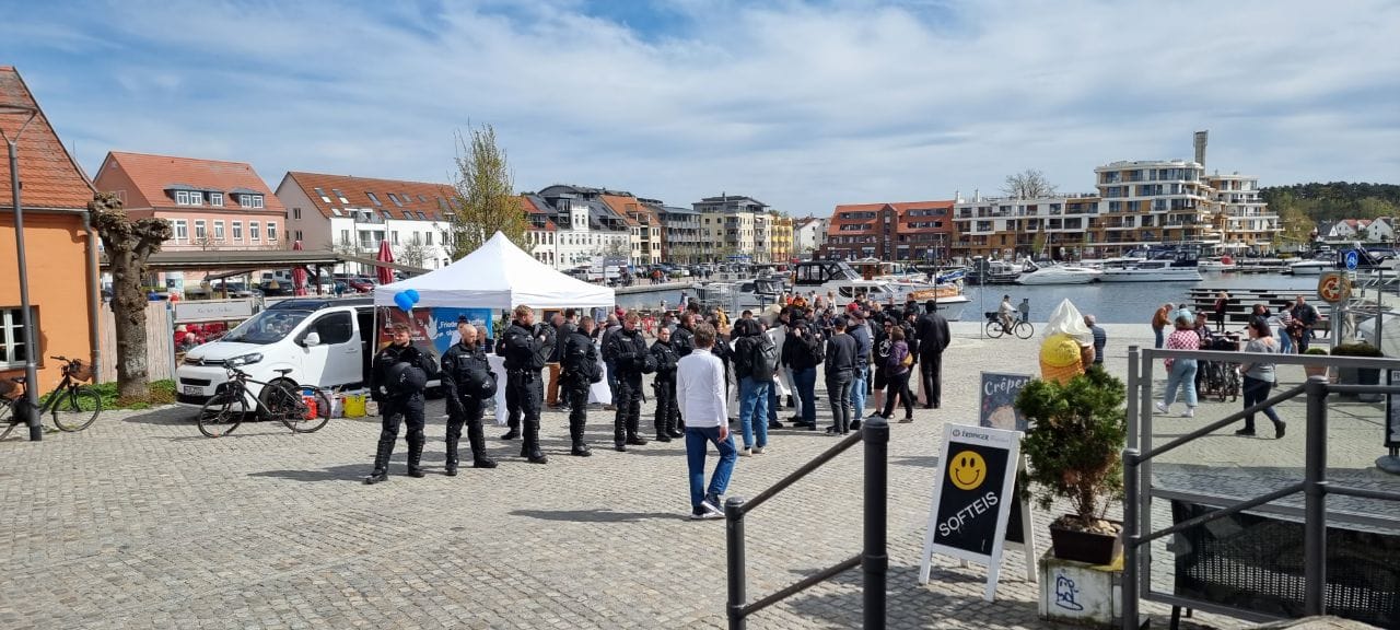 Schluss war dann immer noch nicht, denn die linken Aktivisten hatten am Hafen den Info-Stand der AfD entdeckt. Auch hier musste die Polizei als „Grenze“ zwischen den Mitgliedern der AfD und den Linken herhalten.