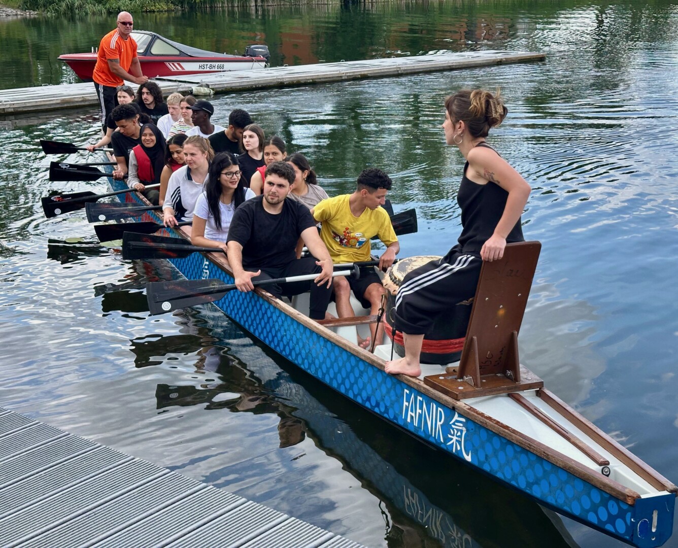 Der in Waren ansässige Lions Club Müritz hatte das Programm in der Müritzstadt organisiert und finanziert. Höhepunkt war ein Drachenbootrennen auf dem Tiefwarensee. Der Müritzsportclub hatte das Drachenboot gestellt und gab Unterstützung durch einen Trainer, der mit an Bord war. Rekordverdächtig war die Zahl von 14 Nationen, die dann gemeinsam ruderten: Neben der deutsche Reiseleiterin ruderten dann junge Frauen und Männer aus Bulgarien, Dänemark, Island, Italien, Kanada, Thailand, Indonesien, Finnland, Brasilien, Mexiko, Indien, Israel und der Türkei. Aus letzterem Land kam Daphne, die die Trommel schwang. Je länger die einstündige Tour dauerte, desto synchroner wurden die gemeinsamen Bewegungen.