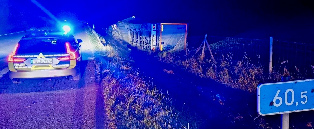 slowenischen Lkw mit Auflieger, beladen mit 13 Tonnen Sammelgut, kam aus derzeit unbekannter Ursache nach rechts von der Fahrbahn ab und kippte anschließend auf die rechte Fahrzeugseite in die Nebenanlage. Dabei wurden die Nebenanlage und der Wildzaun beschädigt. Der Sachschaden wird auf ca. 41.000 Euro geschätzt. Der Fahrzeugführer ist nach eigenen Angaben unverletzt und konnte sich selbstständig aus dem Fahrerhaus befreien. Durch die Bergung des Lasters gibt es in diesem Bereich weiterhin Behinderungen.
