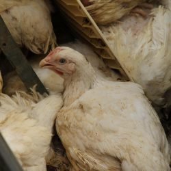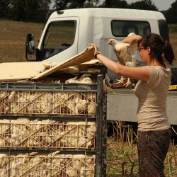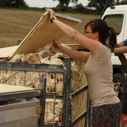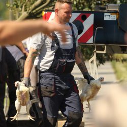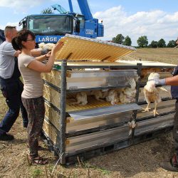 Eine Mitarbeiterin des Veterinäramtes des Landkreises Mecklenburgische-Seenplatte war während der Bergungsmaßnahmen vor Ort und überwachte das Umladen der Masthähnchen.