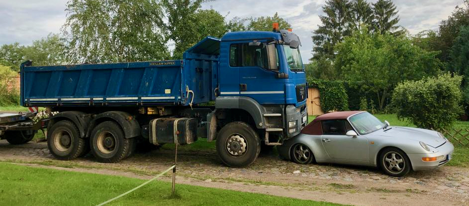 Ein eher ungewöhnlicher Unfall hat heute Morgen in einem Dorf des Amtes Seenlandschaft für heftigen Blechschaden gesorgt. Ein 51-jährige Fahrzeugführer eines Lkw mit Anhänger parkte das Gespann gegen 6:20 Uhr in der Nähe eines Firmengeländes. Zu diesem Zeitpunkt stand ein geparkter Porsche einige Meter vor dem Laster. Nach bisherigen Erkenntnissen wurde der Lkw beim Verlassen des Fahrzeugs nicht ordnungsgemäß gegen das Wegrollen gesichert, in dessen Folge sich das Fahrzeuggespann in Richtung des parkenden Porsche