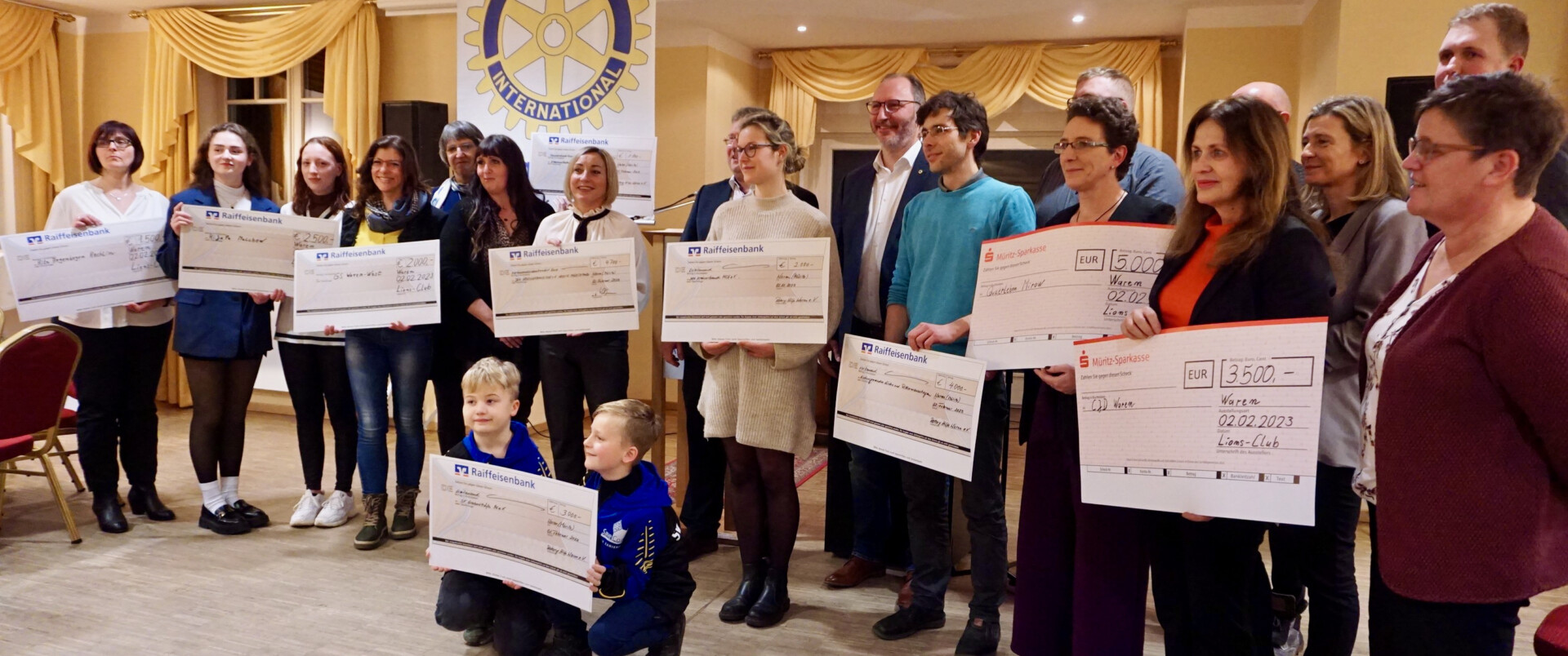 Ganz, ganz viele Schecks auf einmal: Der Lions Club Müritz und der Rotary Club Waren haben vor wenigen Tagen richtig viel „Knete“ verteilt: 40 000 Euro gingen an verschiedene Vereine, Verbände und Projekte der Müritz-Region, vor allem für die Kinder- und Jugendarbeit. Das Geld stammt aus der beliebten Weihnachtslotterie, deren 8000 Kalender wieder komplett verkauft wurden (WsM berichtete). Als kleine Stars entpuppten sich bei der Spendenübergabe übrigens der achtjährige Ben und der neunjährige Jack – beide große Ronaldo-Fans und Mitglied im SV Grabowhöfe, der Geld für ein Sommercamp erhalten hat. Ben und Jack hatten nämlich einen kleine Rede vorbereitet. Zwar waren sei ein wenig aufgeregt, was bei so vielen „wichtigen“ Leuten, die im Saal saßen, auch kein Wunder ist, aber ihre Worte wurden aber mit ordentlich Beifall bedacht.