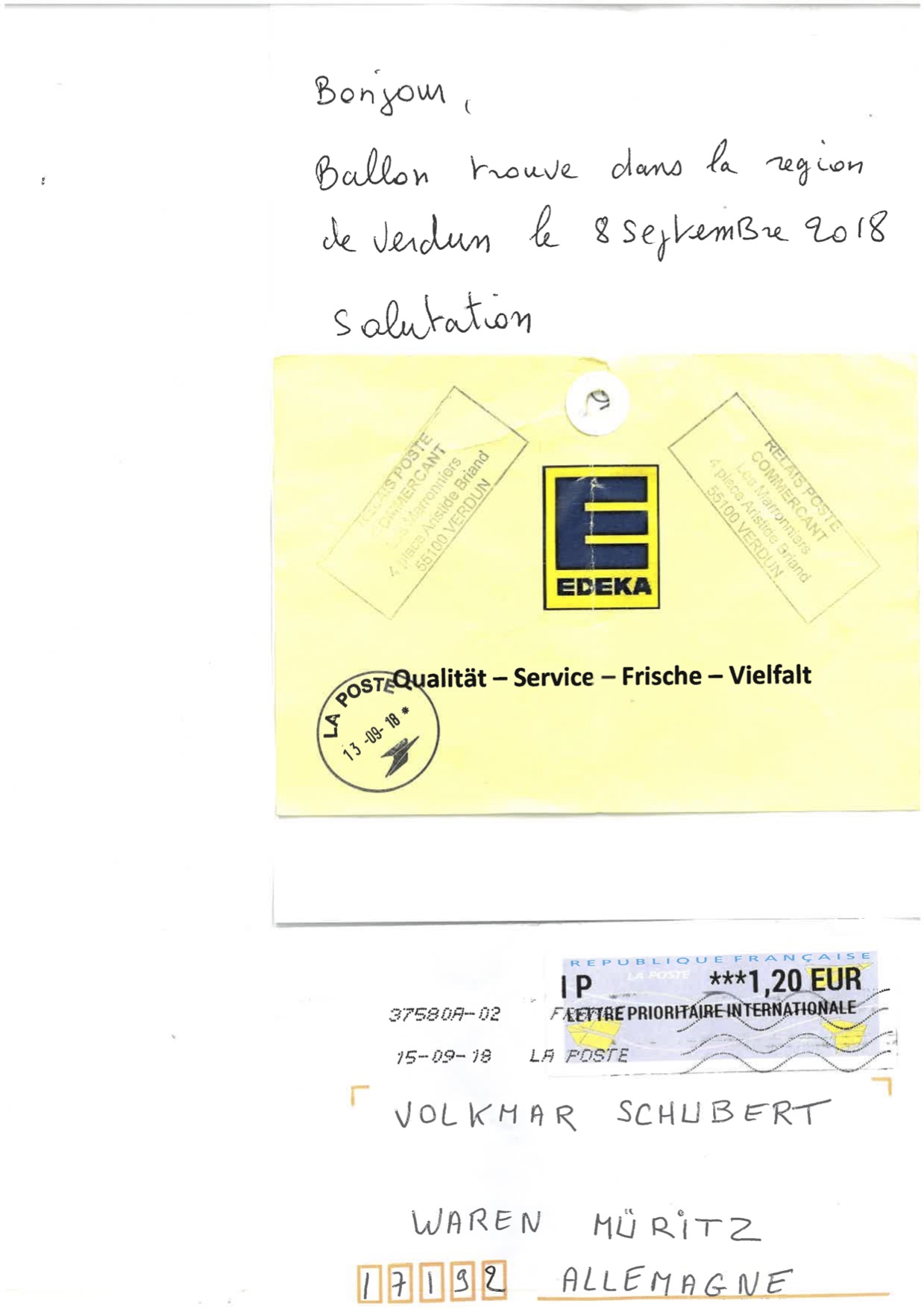 Eine Karte kam jetzt zurück. Sie hat in sieben Tagen hunderte Kilometer zurückgelegt und landete am 8. September in der Region Verdun in Frankreich.