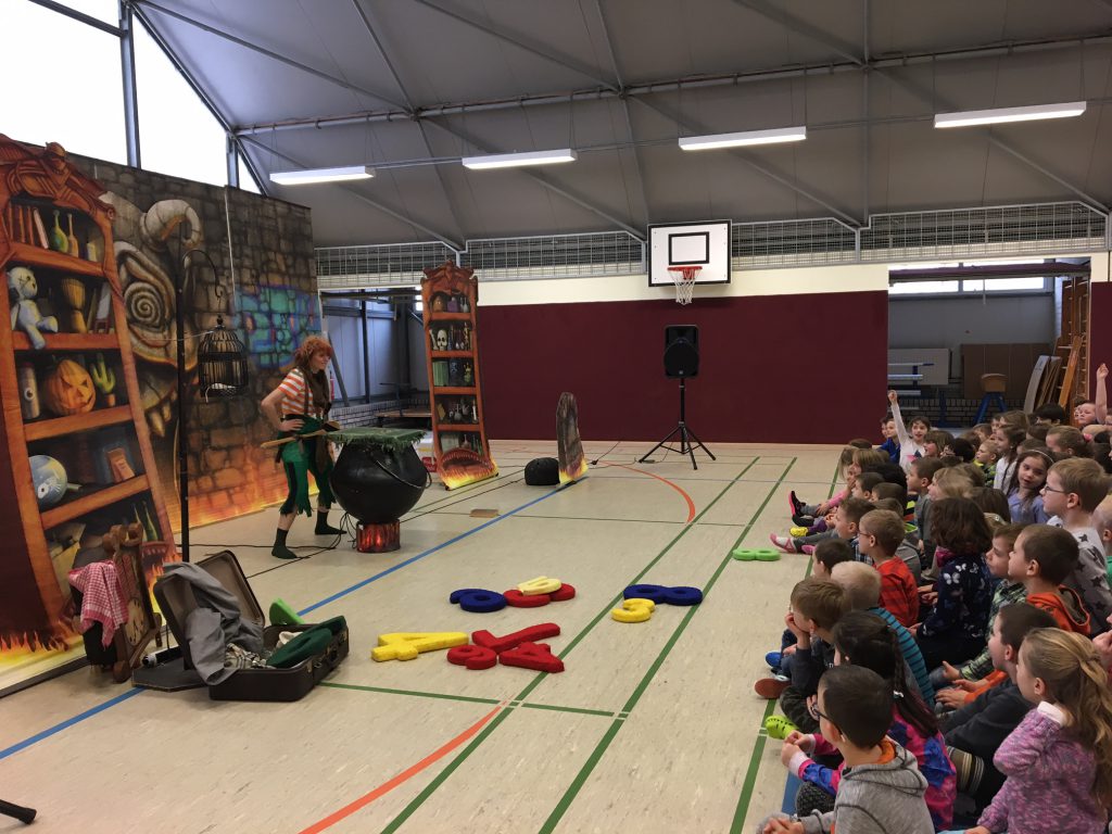 Das Musical „Huckla und die total verrückte Sprachmaschine“ sahen die 3. und 4. Klassen. Dieses ist ein zweisprachiges Musical (Englisch/ Deutsch). Hexe Huckla wollte an einem Hexenwettbewerb teilnehmen und hat dafür eine Sprachmaschine erfunden. Diese ging kaputt und blieb im Englischmodus hängen. Um trotzdem am Wettbewerb teilnehmen zu können, benötigte sie Unterstützung von Mr. Mouse.