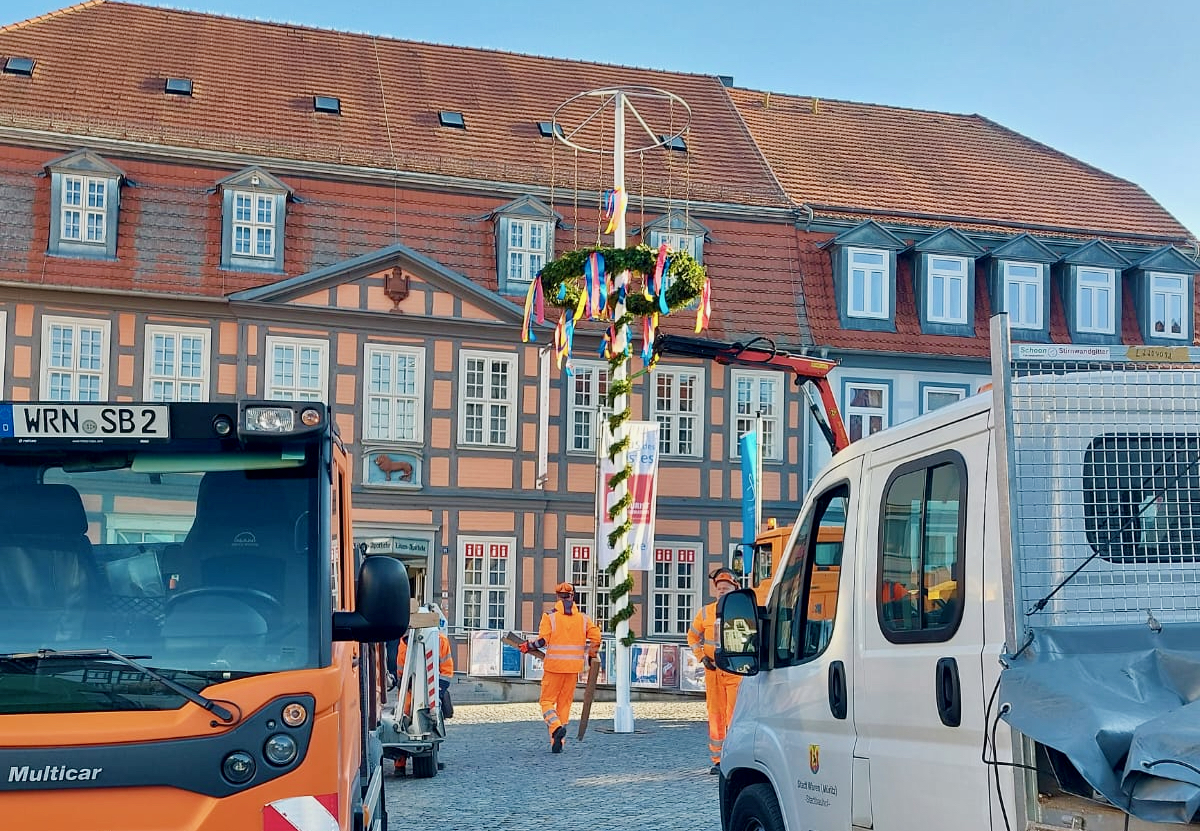 Die Mitarbeiter des Stadtbauhofes waren heute schon ganz früh richtig fleißig, so dass der Maibaum am verlängerten Wochenende Einheimische Gäste auf dem Neuen Markt begrüßt.