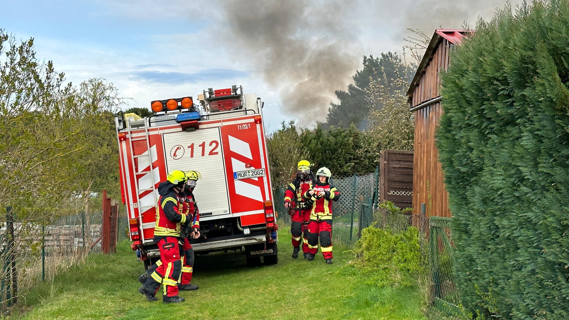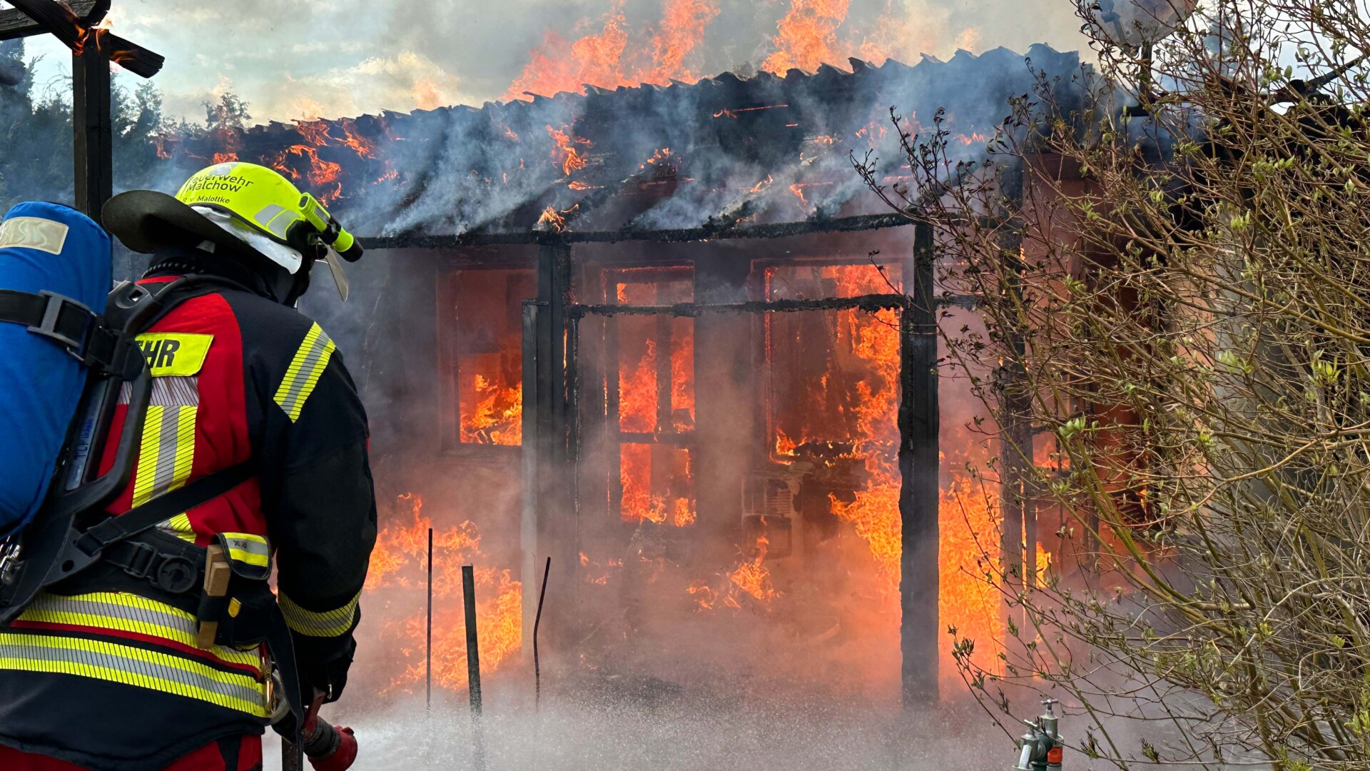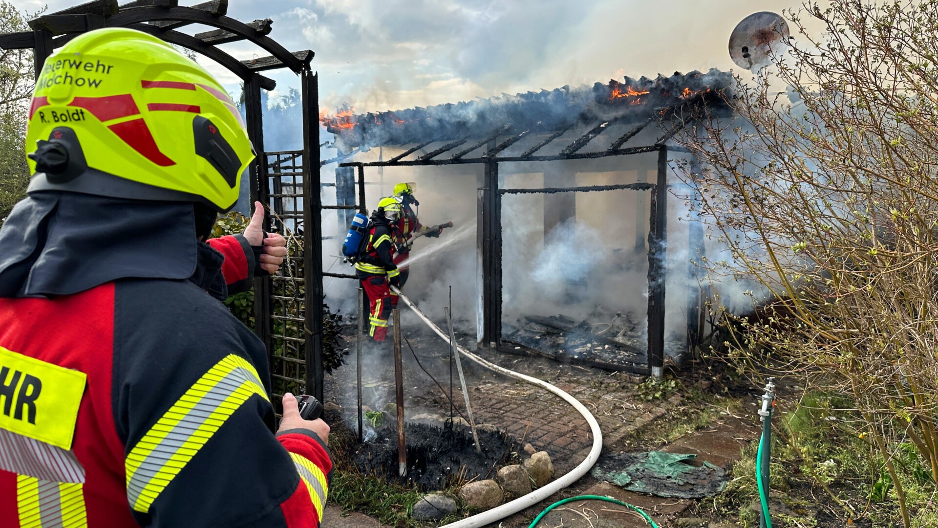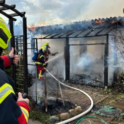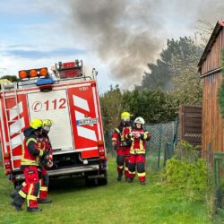 „Insgesamt gingen vier Trupps unter Atemschutz zur Brandbekämpfung vor. Die Laube stand im Vollbrand. Wir waren mit 32 Kameraden vor Ort“, sagte Heiko Delph, Wehrführer der Freiwilligen Feuerwehr Malchow. Eine Gasflasche konnte von den Kameraden noch rechtzeitig in einem Teich gekühlt werden. „In der enormen Hitze hätte die Flasche explodieren können“, so Delph. Eine Zeugin hatte zuvor beobachtet, wie zwei Jugendliche aus der Laube geflüchtet sind. Nur wenige Minuten später stand die Laube in Flammen.
