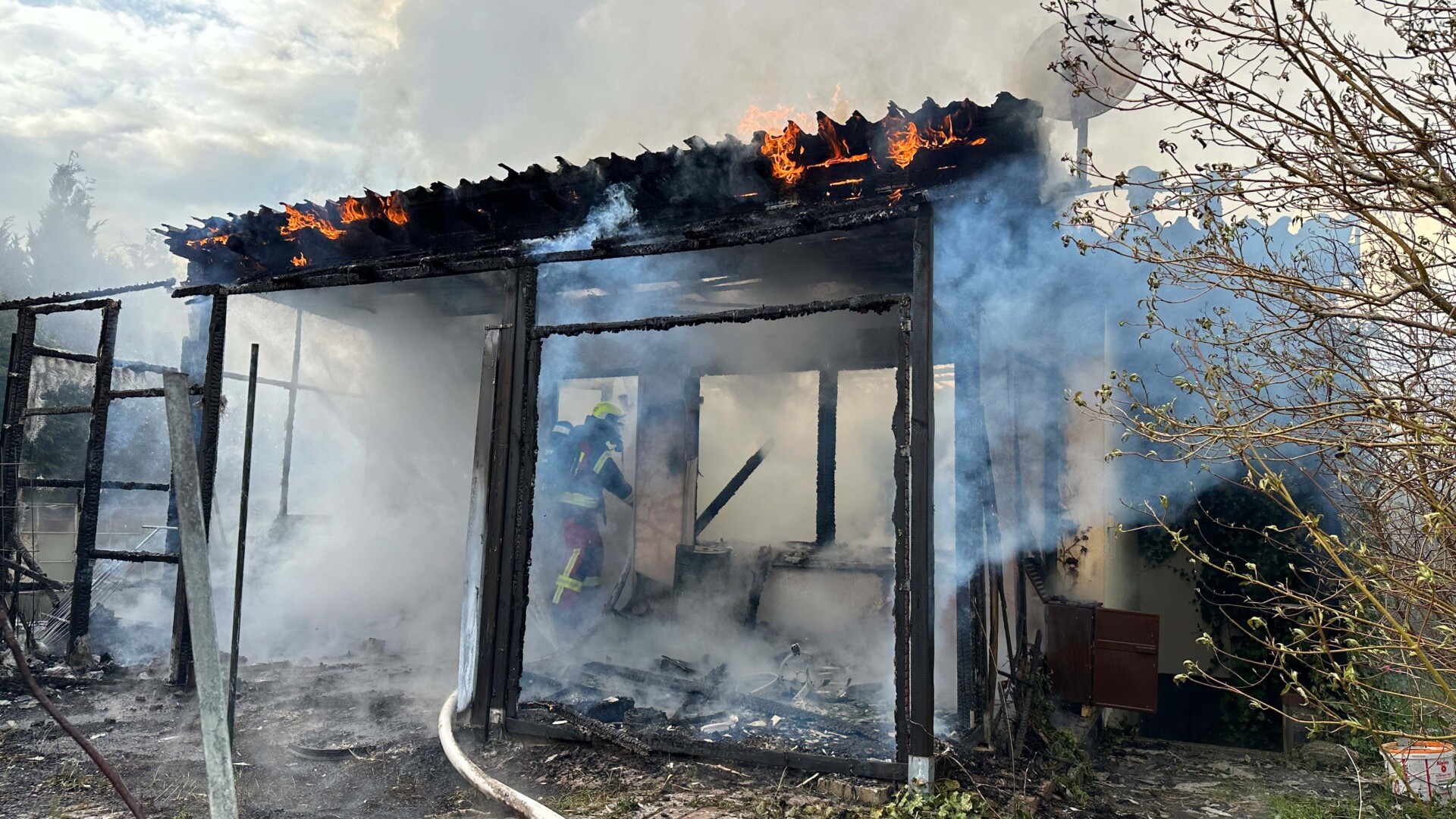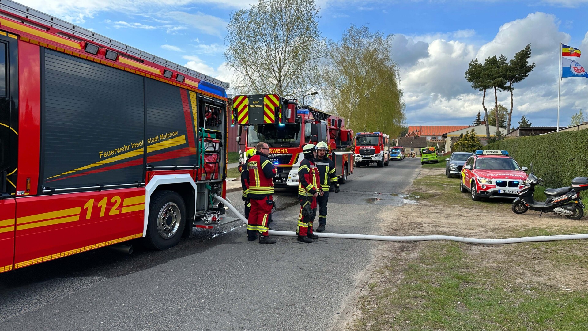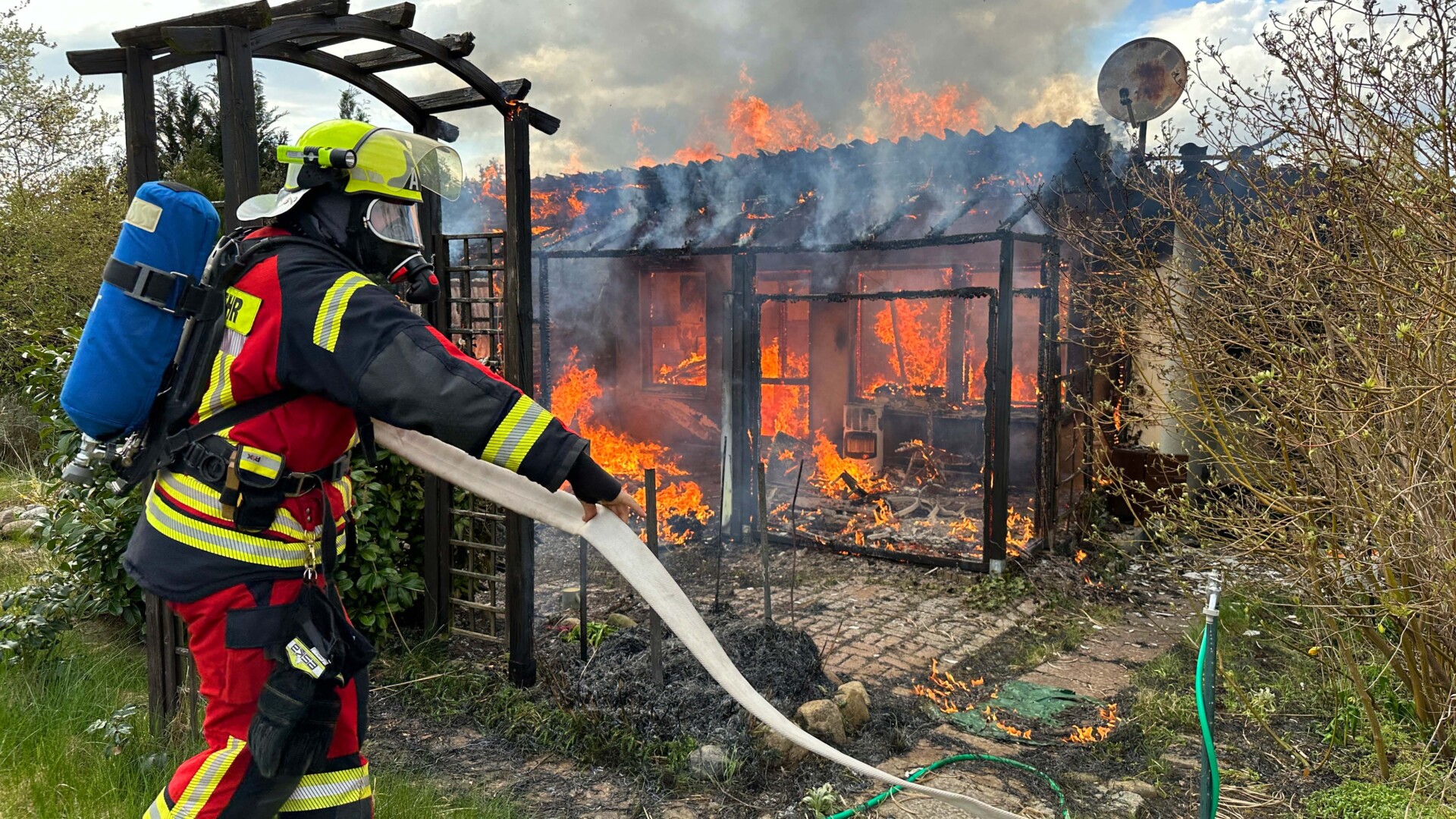„Insgesamt gingen vier Trupps unter Atemschutz zur Brandbekämpfung vor. Die Laube stand im Vollbrand. Wir waren mit 32 Kameraden vor Ort“, sagte Heiko Delph, Wehrführer der Freiwilligen Feuerwehr Malchow. Eine Gasflasche konnte von den Kameraden noch rechtzeitig in einem Teich gekühlt werden. „In der enormen Hitze hätte die Flasche explodieren können“, so Delph. Eine Zeugin hatte zuvor beobachtet, wie zwei Jugendliche aus der Laube geflüchtet sind. Nur wenige Minuten später stand die Laube in Flammen.