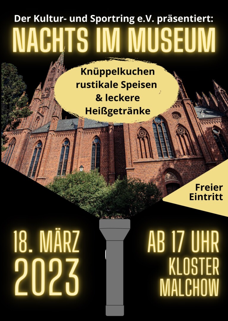„Pack die Taschenlampe ein und ab ins Malchower Kloster“ ist das Motto am Sonnabend ab 17 Uhr. Denn „Nachts im Museum“ kann man einiges erleben. Im Klostercafé und auf dem Damenplatz mit Feuerschalen und Fackeln umgeben gibt es beispielsweise leckeren Knüppelkuchen, Marshmallows und Deftiges aus dem Topf sowie leckere Heißgetränke. Um 18 Uhr startet im Kreuzgang vor dem Kunstmuseum eine kleine spannende und rätselhafte Museumstour, die für Groß und Klein geeignet ist. „Packt die Taschenlampe ein und entdeckt mit uns spielerisch das Kunst- und Orgelmuseum in der Klosterkirche“, locken die Veranstalter. Der Eintritt ist frei.