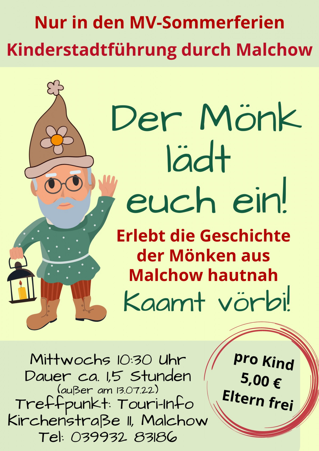 Coole Idee: In Malchow gibt es in den Ferien eine Stadtführung nur für Kinder – Eltern dürfen natürlich mit dabei sein. Immer mittwochs wird den Mädchen und Jungen dabei die Geschichte der Mönken aus Malchow erzählt. Und nebenbei lernen sie viel über die Inselstadt. Das ist sicherlich nicht nur für Urlauber-Kinder spannend, sondern auch für Malchower Kids oder auch kleine Entdecker aus Waren, Röbel und Umgebung.
