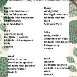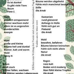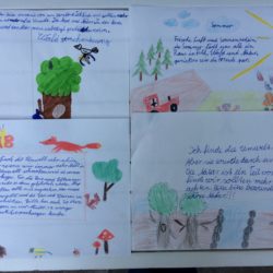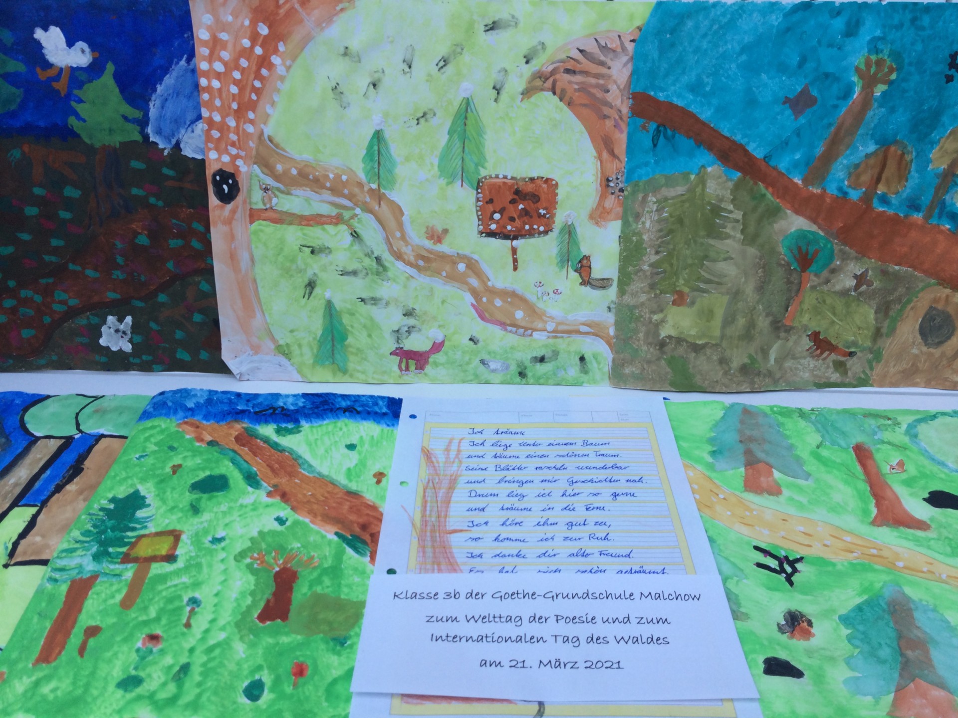 Vier dritte Klassen fertigten als freiwillige Hausaufgabe Zeichnungen, kurze Texte und Elfchen zum Thema Wald und Umwelt. Die Klasse 6a der Fleesenseeschule schrieb “ … mit großem Interesse haben wir Ihren Aufruf zum Dichten für den Welttag der Poesie am internationalen Tag des Waldes gesehen. Wir sind die Klasse 6a der Fleesenseeschule Malchow und einige von uns haben nach dem Dichten im Unterricht mit unserer Deutschlehrerin Frau Nehls beschlossen, unsere Elfchen einzusenden. Herzliche Grüße, die 6a“.