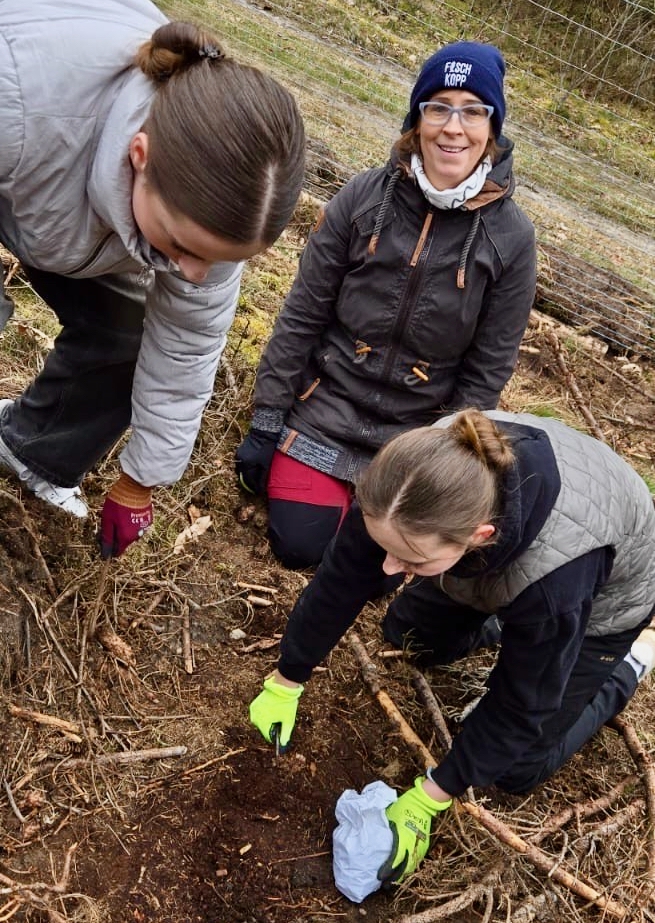 Mit viel Spaß und großem Engagement wurden kleine Löcher in den vorbereiteten Waldboden gebohrt und alle 25 Zentimeter eine Eichel im Boden „versteckt“. Alle waren mit Begeisterung dabei, auch mit dem Wissen hier etwas für ihre eigene Zukunft zu tun.