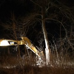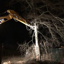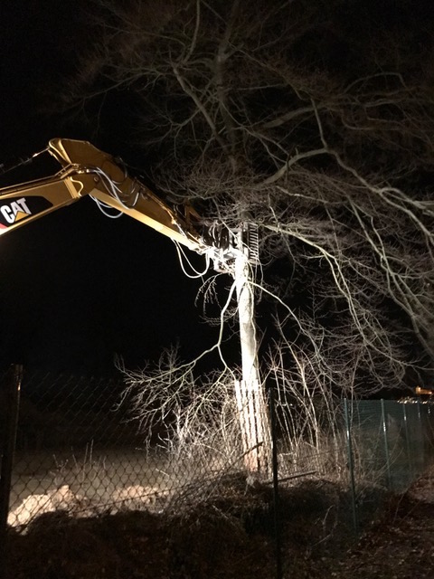 Kurz nach Einbruch der Dunkelheit rückte der Bauunternehmer heute mit Tieflader und Kran an und hat mit der Beseitigung der Bäume begonnen.