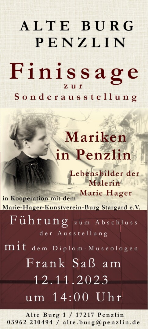 Seit einigen Monaten ist in der Alten Burg Penzlin die Ausstellung „Mariken in Penzlin. Lebensbilder der Malerin Marie Hager“ zu sehen. Zum Abschluss dieser Sonderausstellung gibt es am 12. November ab 14 Uhr noch einmal die Möglichkeit, die Ausstellung gemeinsam mit dem Diplom-Museologen Frank Saß zu erkunden.
