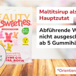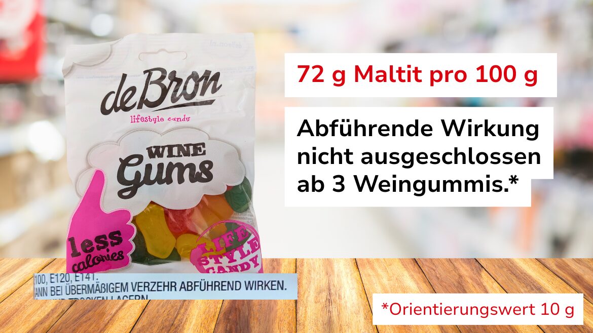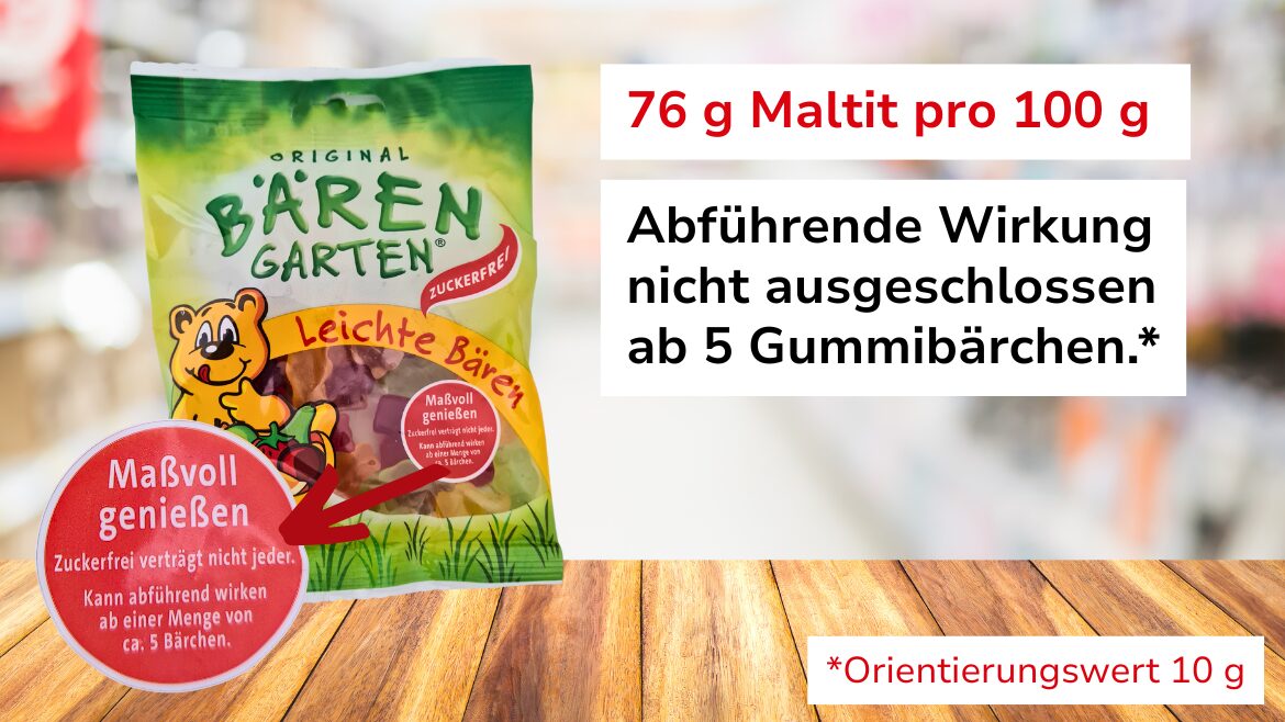 Eine detaillierte Kennzeichnung auf der Schauseite, wie viele Fruchtgummis man höchstens essen sollte, um keine abführende Wirkung zu riskieren, weisen die Packungen zweier Fruchtgummi-Marken (Original Garten Bären Leichte Bären und Beauty Sweeties) auf: Die Grenze liegt bei jeweils fünf Stück.