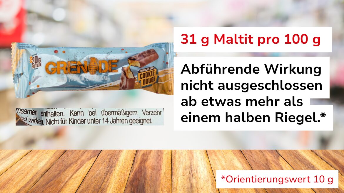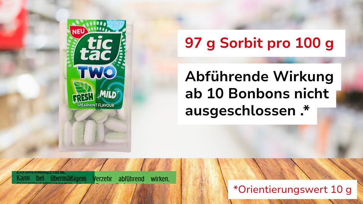 Den höchsten Gehalt an Zuckeralkoholen in der Stichprobe weisen mit 97 Prozent die zuckerfreien Tictac Two Fresh & Mild Spearmint Flavor Minzbonbons auf. Sie bestehen fast ausschließlich aus Sorbit. 17 Prozent enthält der Low sugar chocolate bar Hazelnut Cocoa von Ahead. Etwas mehr als ein halber Crunchy Vanilla & White Choc Proteinriegel von Corny oder ein halber Chocolate Chip Cookie Dough Proteinriegel von Grenade oder drei WineGums von De Bron reichen aus, um diesen kritischen Wert zu überschreiten. „Solche Mengen versteht niemand unter einem übermäßigen Verzehr. Im Internet finden sich zahlreiche Beiträge von Verbraucher, die von ihren negativen Erfahrungen mit Lebensmitteln berichten, die große Mengen Maltit oder Sorbit beinhalten“, so Fischer