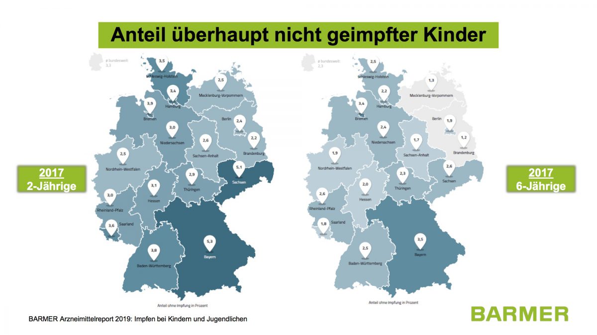 Immerhin 1,3 Prozent der Sechsjährigen sind komplett ungeimpft (Bund: 5,2 Prozent). „Unbestritten hat Mecklenburg-Vorpommern eine der höchsten Masernimpfquoten bundesweit. Erschreckend ist jedoch, dass die Zahl derjenigen, die nicht oder nicht vollständig geimpft sind, nach unserer Studie sehr viel höher ist, als bisher angenommen. Man darf nicht vergessen, dass Masern keine harmlose Kinderkrankheit sind, sondern es bei jedem zehnten Erkranktem zu ernsten Komplikationen kommen kann“, warnt der BARMER-Landeschef.