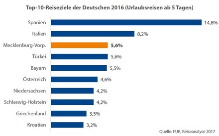 Demnach verzeichnet das norddeutsche Bundesland einen Marktanteil von 5,6 Prozent an allen 2016 angetretenen Urlaubsreisen der Deutschen (ab fünf Tagen Dauer) und liegt damit 0,1 Prozentpunkte vor Bayern. Zudem hält Mecklenburg-Vorpommern den deutlichen Abstand zu den Küstenländern Niedersachsen und Schleswig-Holstein, die mit jeweils 4,2 Prozent folgen. Auch im Vergleich mit den internationalen Reisezielen der Deutschen behauptet sich Mecklenburg-Vorpommern gut: Hinter dem unangefochtenen Spitzenreiter Spanien (14,8 Prozent) und Italien (8,2 Prozent) erreicht das Urlaubsland gleichauf mit der Türkei erstmals einen Podestplatz.