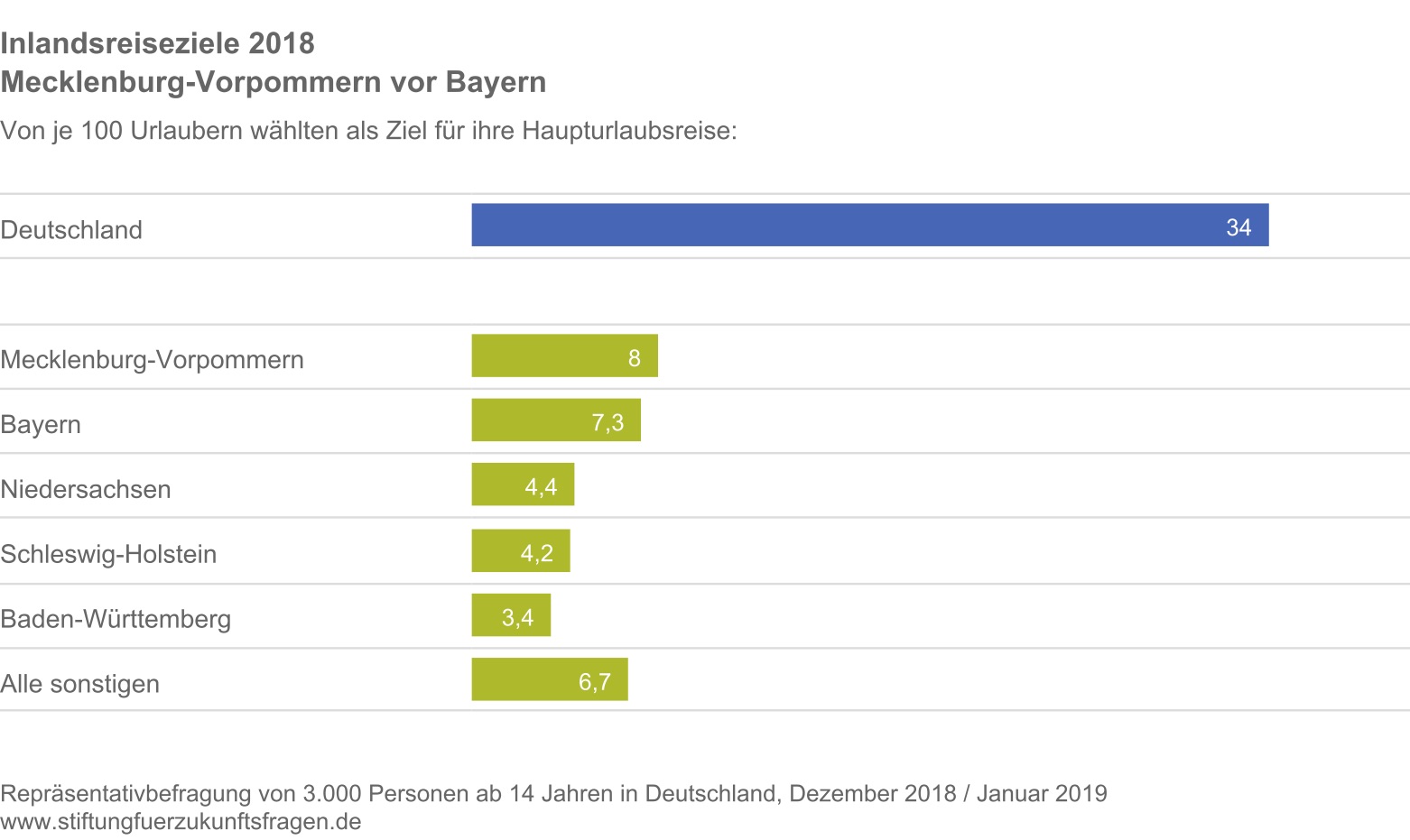 Ausgebuchte Hotels von Rügen bis Oberammergau. Deutschland war auch 2018 das – mit großem Abstand – beliebteste Reiseziel der Deutschen. Mehr als jeder dritte Reisende verbrachte seinen längsten Urlaub des Jahres (mindestens 5 Tage Dauer) zwischen den Küsten im Norden und den Bergen im Süden der Republik. Der Zweikampf zwischen Mecklenburg-Vorpommern und Bayern ging 2018 in die nächste Runde. Gewinner waren diesmal die Reiseziele in Mecklenburg-Vorpommern. Das heißt: Unser Bundesland war das beliebteste Reiseziel.