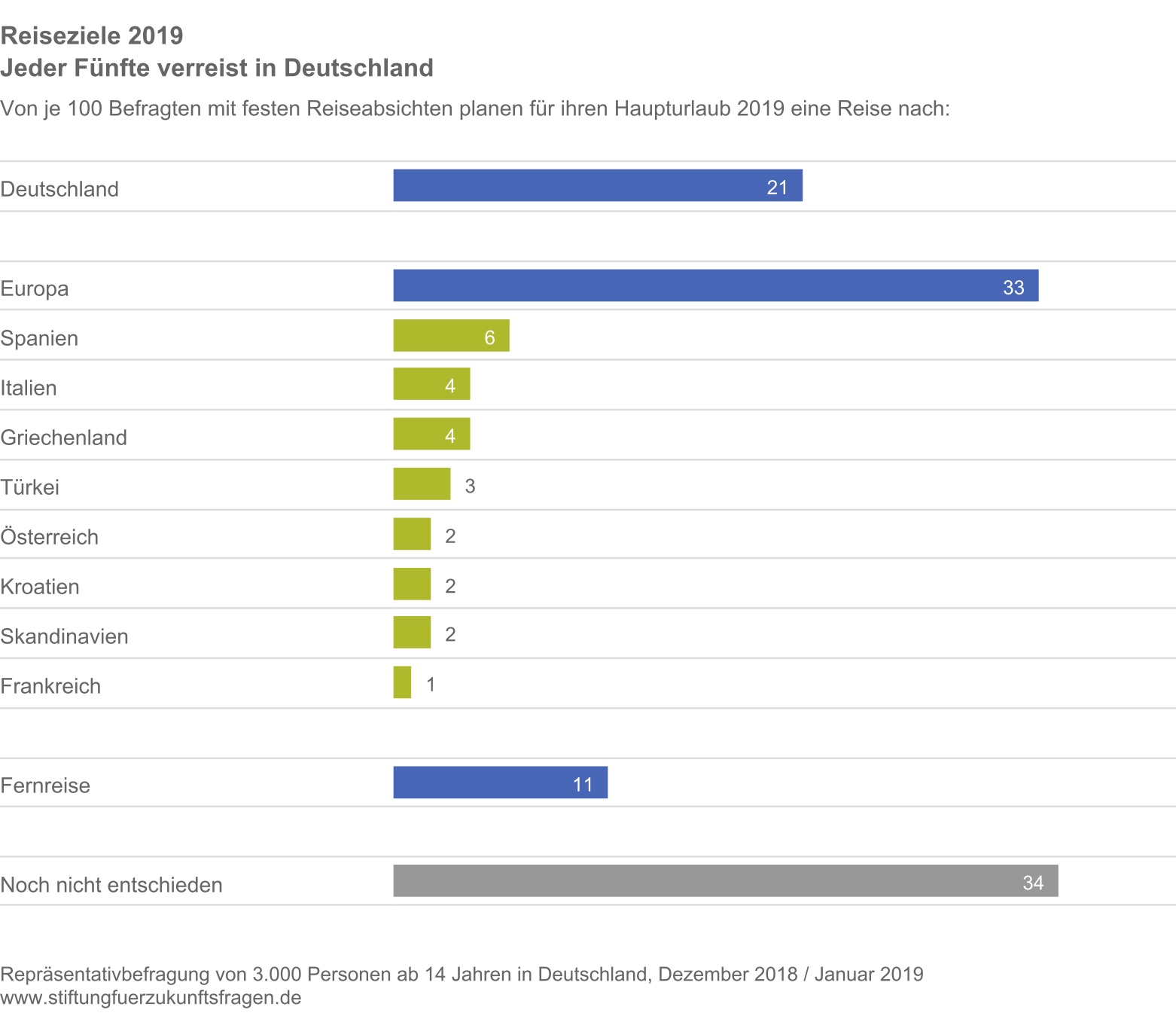 Die Reiseziele 2019 zeigen es ganz deutlich: Deutschland bleibt das beliebteste Reiseziel und Inlandstourismus ist im Trend. Jeder fünfte Bundesbürger plant bereits jetzt, seinen Haupturlaub im eigenen Land zu verbringen, und jeder dritte Urlauber ist sich sicher, in Europa unterwegs zu sein. Vor allem Urlaubsdestinationen in Spanien, Italien und Griechenland sind dabei gefragt.