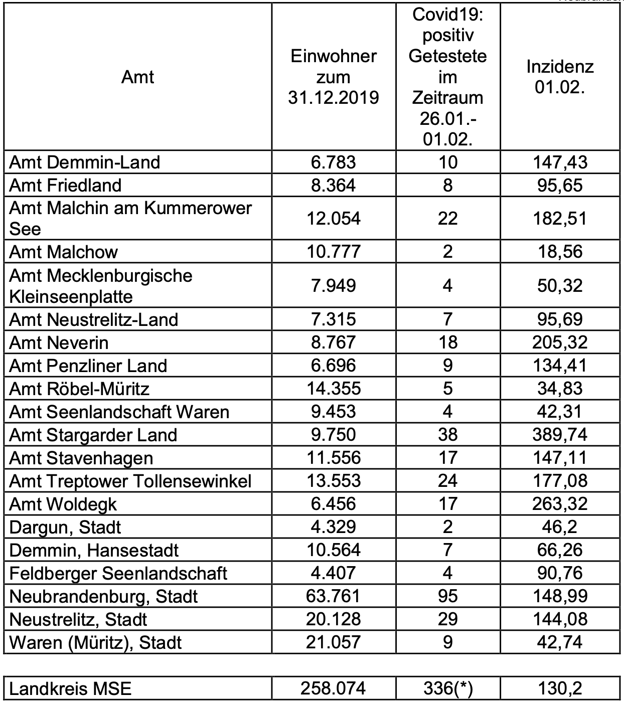 Der Landkreis Mecklenburgische Seenplatte hat heute wieder die Corona-Zahlen – aufgeschlüsselt nach Städten und Ämtern – bekanntgegeben. Demnach hat das Amt Stargarder Land mit 389,74 den höchsten Inzidenzwert, gefolgt vom Amt Woldegk mit 263,32 und dem Amt Neverin mit 205,32. Die niedrigste Inzidenz wird für Malchow mit 18,56 gemeldet. Das Amt Penzliner Land liegt bei 134,41, das Amt Röbel-Müritz bei 34, 83, das Amt Seenlandschaft Waren bei 42,31 und die Stadt Waren (Müritz) bei 42,74.