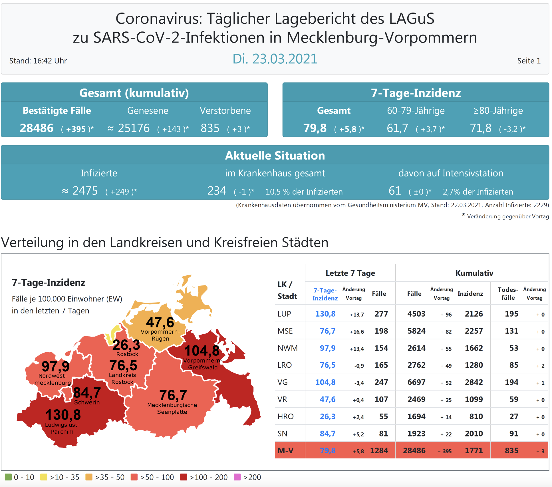 Der Inzidenzwert für ganz Mecklenburg-Vorpommern ist ebenfalls weiter gestiegen und liegt heute bei (gestern 74,0). Insgesamt meldet das Land Mecklenburg-Vorpommern heute 395 Neuinfektionen. Die höchste Inzidenz hat der Landkreis Ludwigslust-Parchim mit heute 130,8.