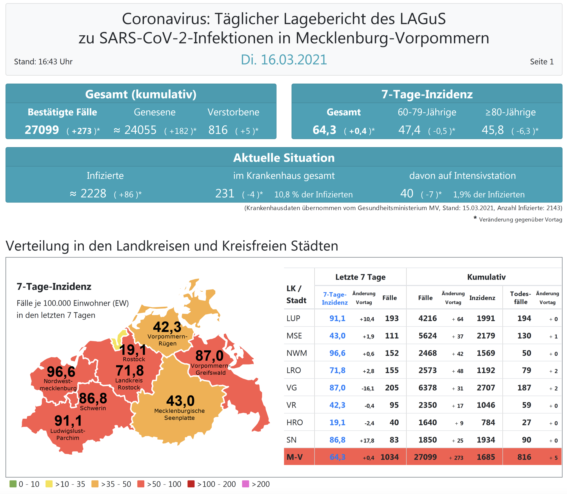 Der Inzidenzwert für ganz Mecklenburg-Vorpommern ist leicht gestiegen und liegt heute bei 64,3 (gestern 63,9 ). Insgesamt meldet das Land Mecklenburg-Vorpommern heute 273 Neuinfektionen. Die höchste Inzidenz hat der Landkreis Nordwestmecklenburg mit heute 96,6.