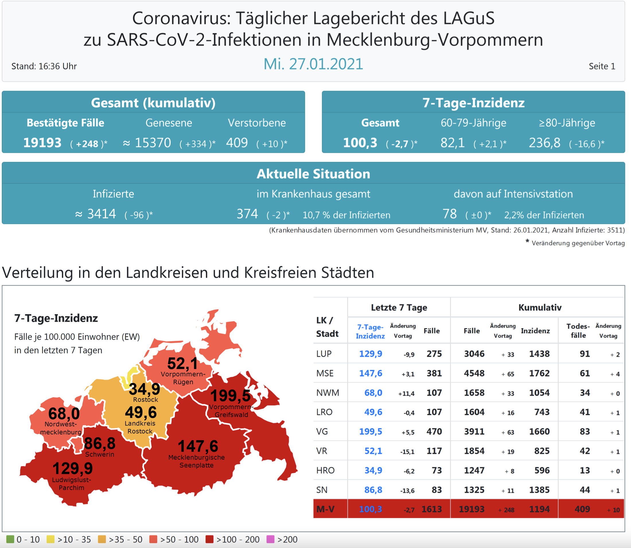 Insgesamt meldet das Land Mecklenburg-Vorpommern heute 248 Neuinfektionen. In ganz Mecklenburg-Vorpommern liegt der Inzidenzwert heute bei 100,3 (gestern 103) und ist damit ganz leicht gesunken.