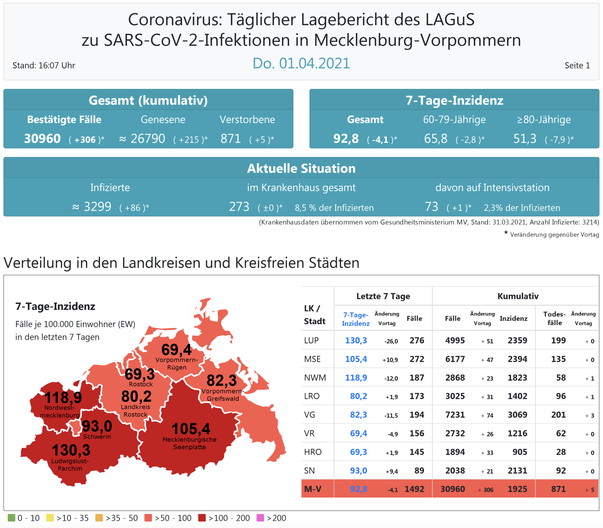 Der Inzidenzwert für ganz Mecklenburg-Vorpommern bleibt unter 100 und liegt heute bei 92,8 (gestern 97,0). Insgesamt meldet das Land Mecklenburg-Vorpommern heute 306 Neuinfektionen. Die höchste Inzidenz hat der Landkreis Ludwigslust-Parchim mit heute 130,3.